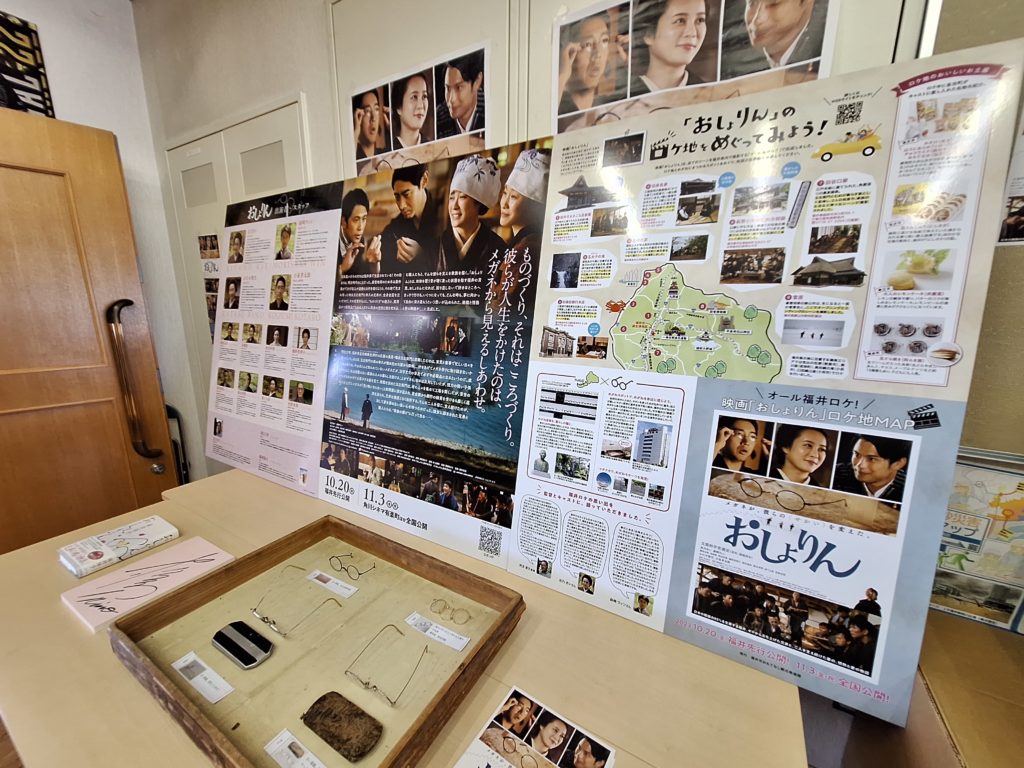 麻生津公民館には、地域の誇る様々な情報が集まります。今は、映画「おしょりん」の資料がたくさん並んでいます。増永眼鏡さんが提供してくださった昔の珍しい眼鏡も置いてあります。地域の方が、映画「おしょりん」の新聞記事を集めた資料集も作成され、飾られています。皆さんの熱い思いが伝わります。