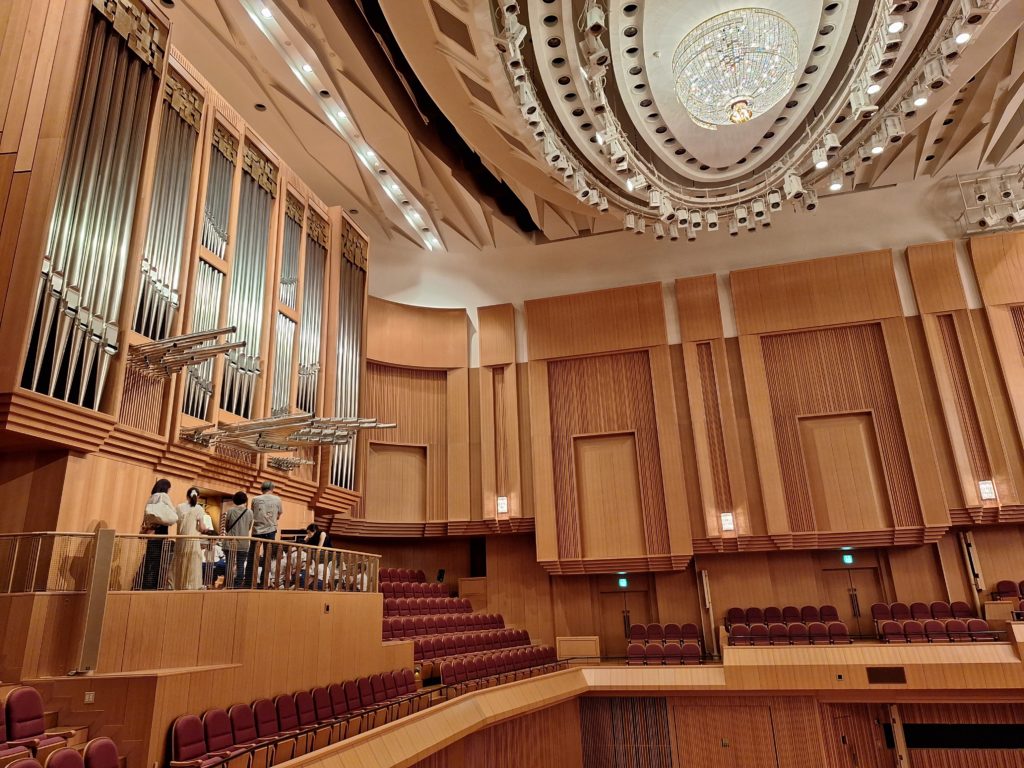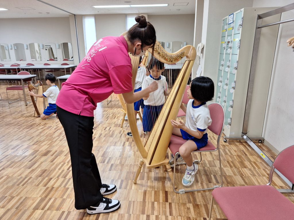 バイオリンで意外といい音が出せていたり、ハープの音階を教えてもらったり、音楽の楽しみ方をたくさん味わうことができました。事前にオンライン授業のお話もいただくことができ、「世界でも美しい音楽堂の一つに数えられる場所」が校区の身近にあることを嬉しく思ったことでしょう。