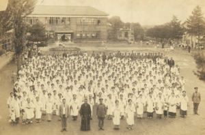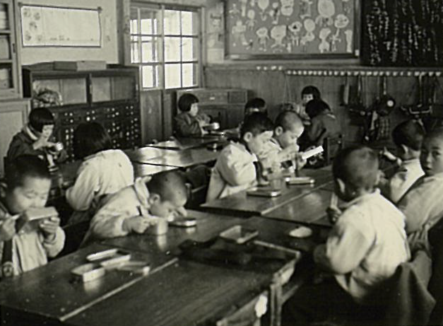 そこで、本校の記録写真から「食」につながるものはないかと探してみました。たった1枚みつかったのは、本校併設だった幼稚園の食事風景写真です。年度も分からないのですが、確かに大きさとか形が異なるアルミの弁当箱を使っていたようです。
