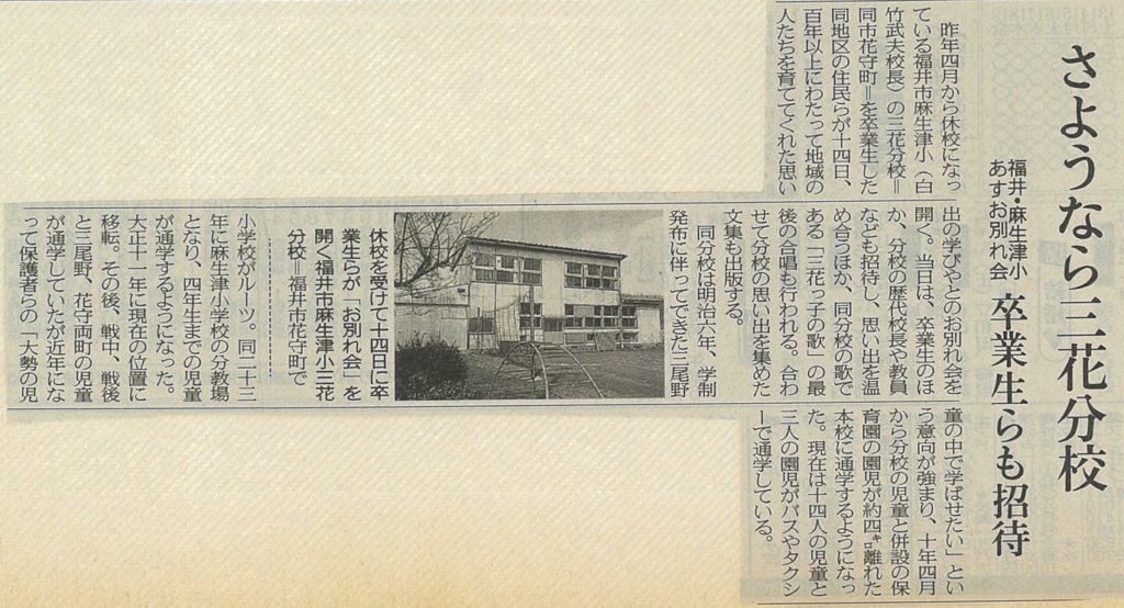 三花分校お別れ会当時の新聞記事によると、分校は、明治はじめの三尾野小学校をルーツにして、明治23年に麻生津小学校分教場となった歴史があるそうです。今も、三尾野・花守の両町から、本校へ元気に登校してくれている子どもたちがいます。
