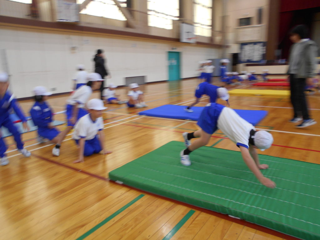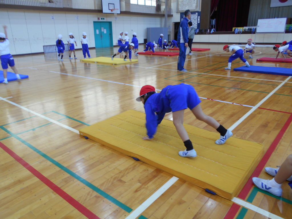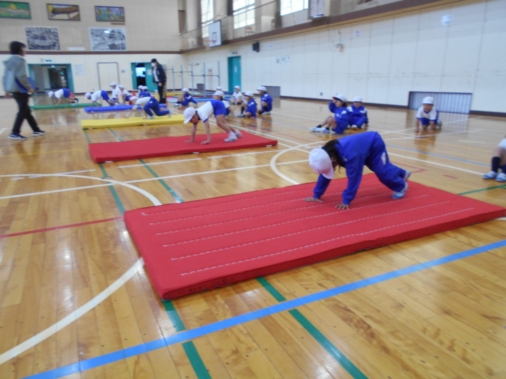 寒さに負けず元気な1年の体育授業。マットを使って運動遊びで基本の動きを楽しく学んでいます。はじめは「いぬになった動き」で、身体もあたたまり手のつき方も上手になり、次は「クマになった動き」に発展させています。