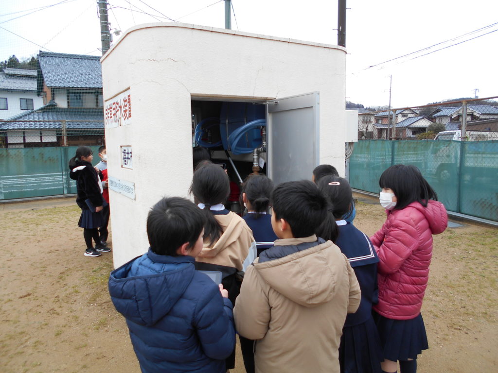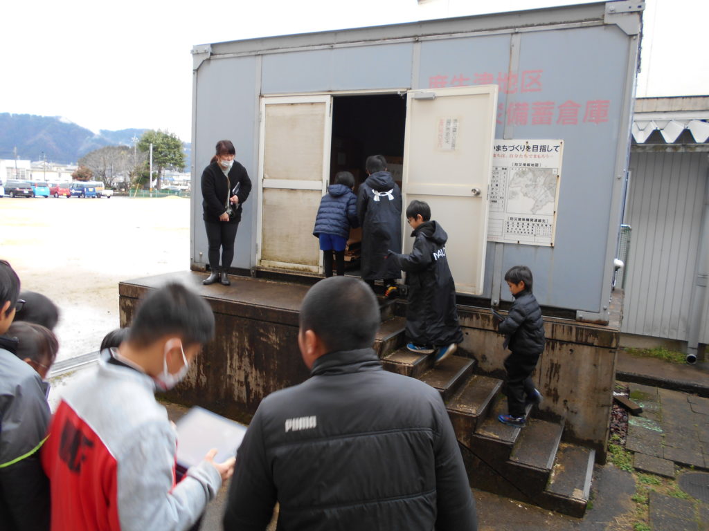 4年生が防災学習のために、タブレット持参で、学校敷地内の倉庫などを見学しています。日常でなかなか見ないところなので、興味津々で扉を開けています。