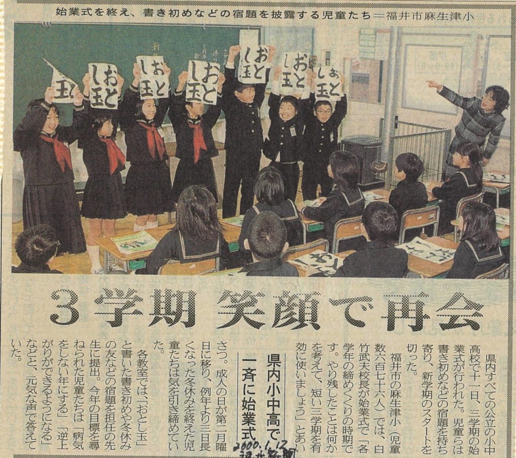 少子化の波が福井にも来ていて、この24年間で、児童数は300名以上減りました。それでも、こうして新聞記事になるのは、多くの方々が、元気いっぱいの子どもたちの姿を見て喜んでくださるからだろうと思います。何年経っても子どもは未来を拓く希望。みんなで今年もがんばります。
