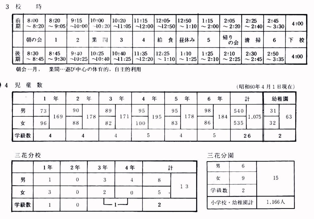 昭和60年ごろの麻生津小学校は、三花分校、三花分園があり、幼稚園も併設でした。そんな時期の学校要覧の資料には、驚きの数字が書かれています。