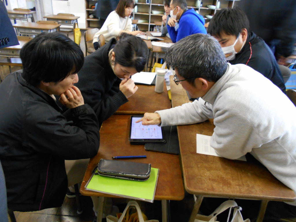 教員が放課後集まって、第6回のICT活用「デジタル教科書」研修をしています。研究所から二人の先生方にもお越しいただいて、何ができるか、どう使うと効果的か、考え合っています。