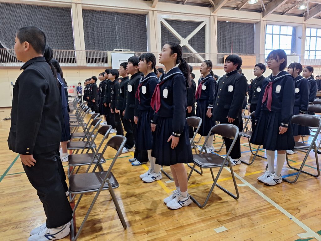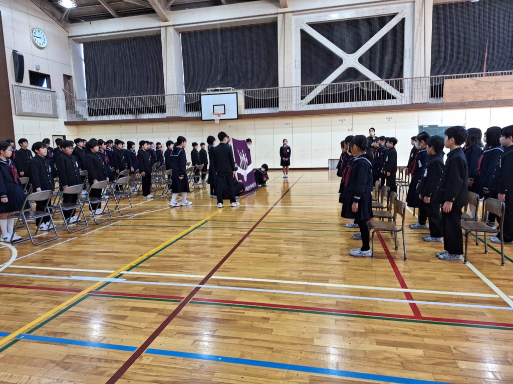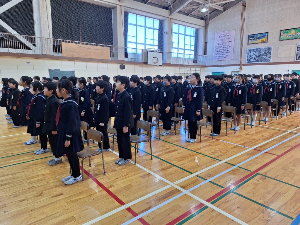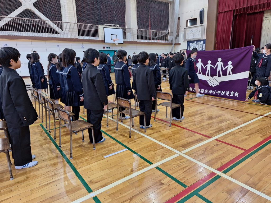 春の青空のもと、卒業証書授与式の予行を行いました。児童会の旗を渡してリーダーの引継ぎも行いました。