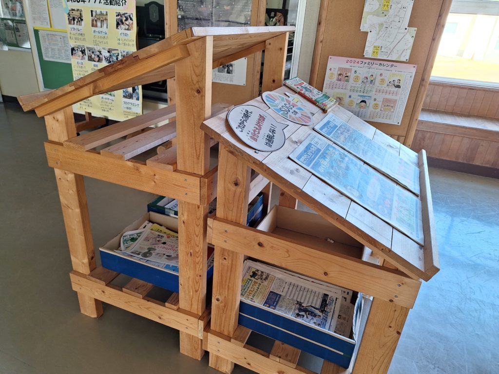 本校の玄関には、手作りの大小2台の新聞台があります。低い台には、イラストや写真が分かりやすいこども新聞があり、高い台には、地元新聞があります。