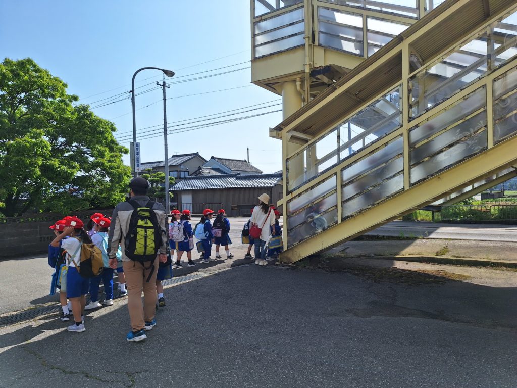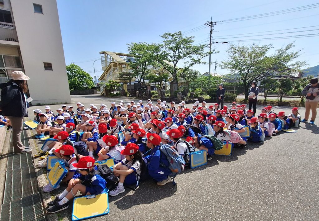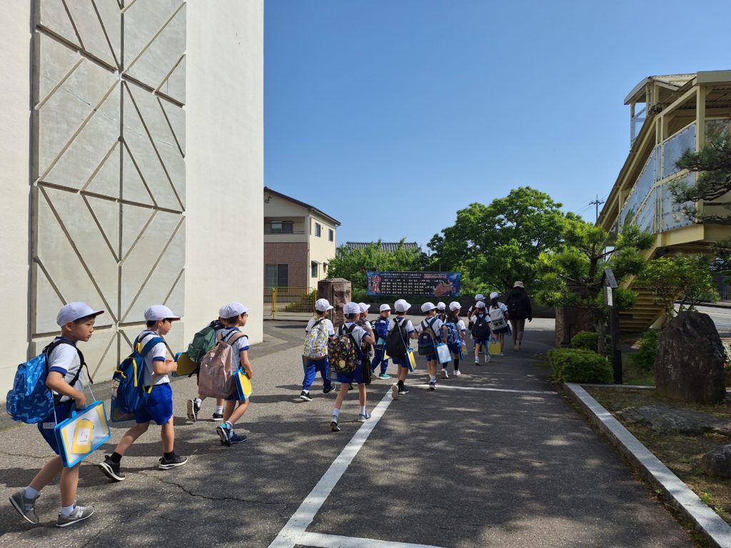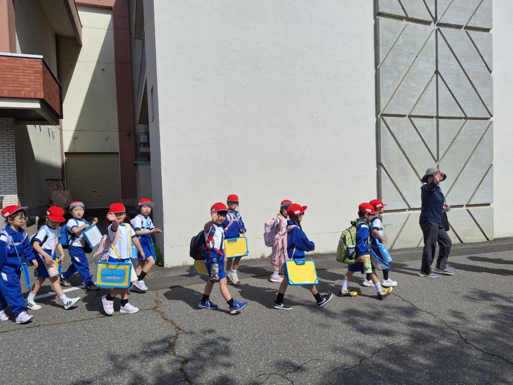 1年生、2年生がはじめて一緒に行く校外学習。今は風もなく、雲一つなくいい天気です。「動物見て絵を描くの」「電車に乗るのが楽しみ」「お弁当に水の生き物の形の海苔が入っているよ」と、みんながわくわく嬉しそうに出発しました。