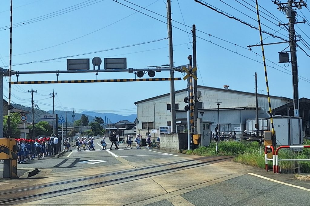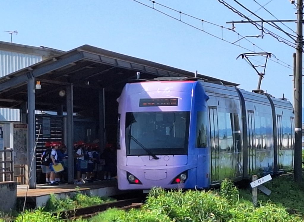 福井鉄道の泰澄の里駅で待っていると、やってきたのは紫色の「紫式部」デザインの綺麗な電車です。集団で公共交通機関に乗るのもいい経験です。