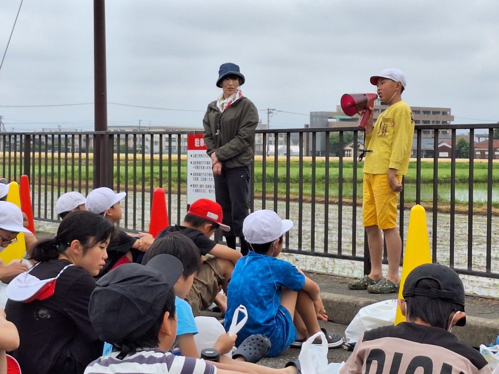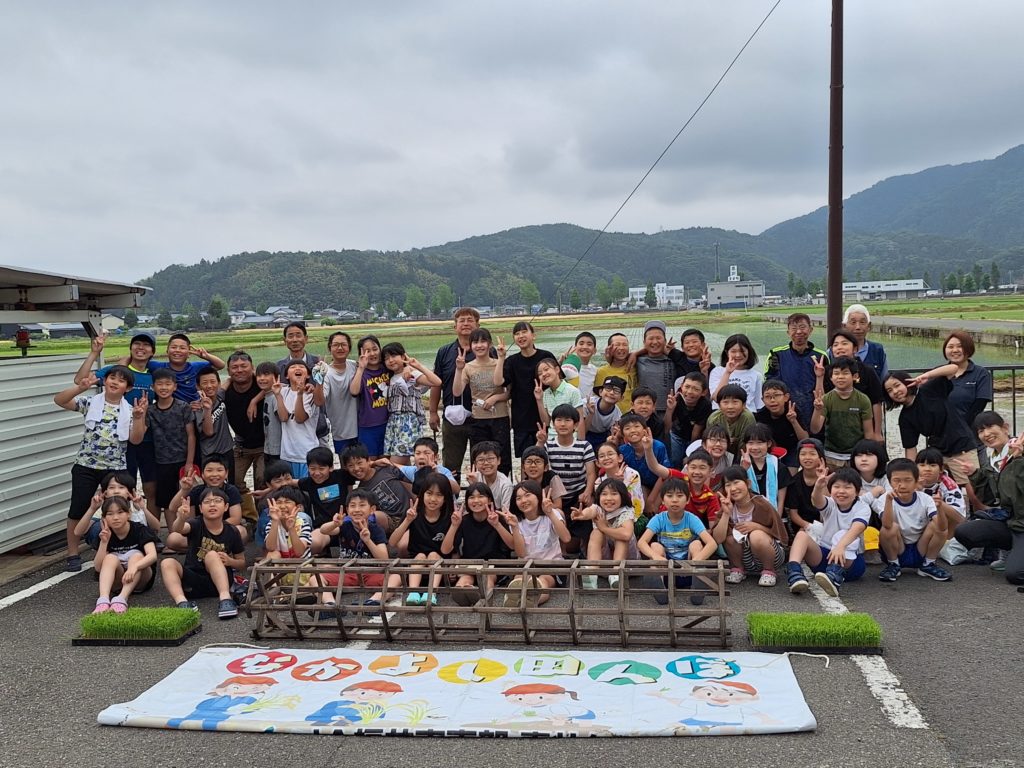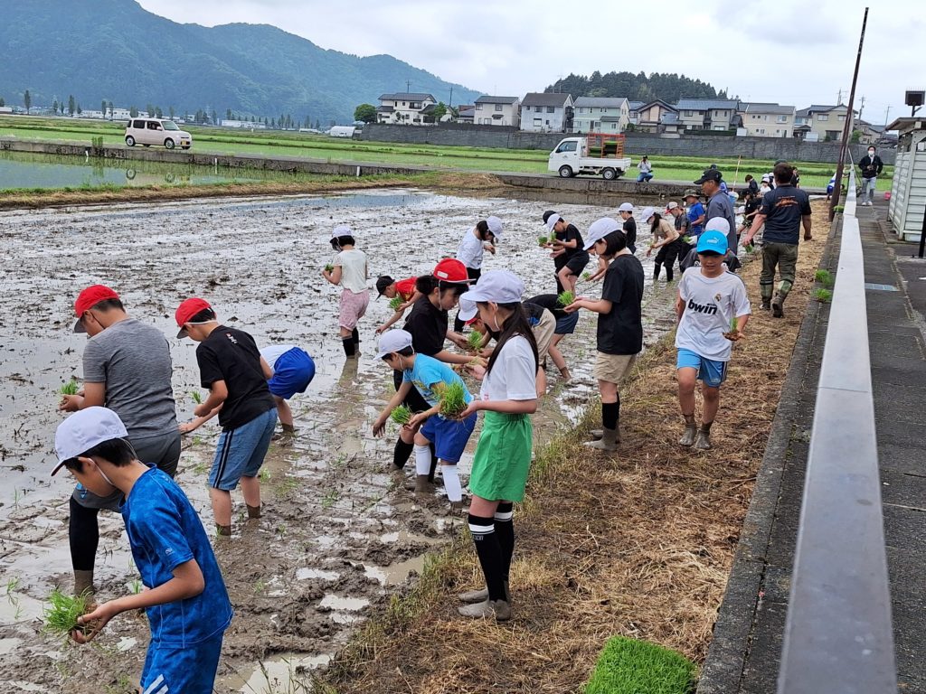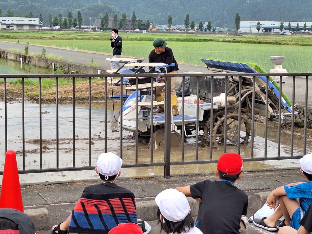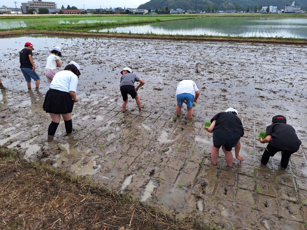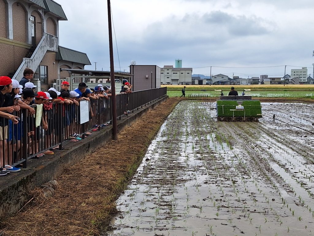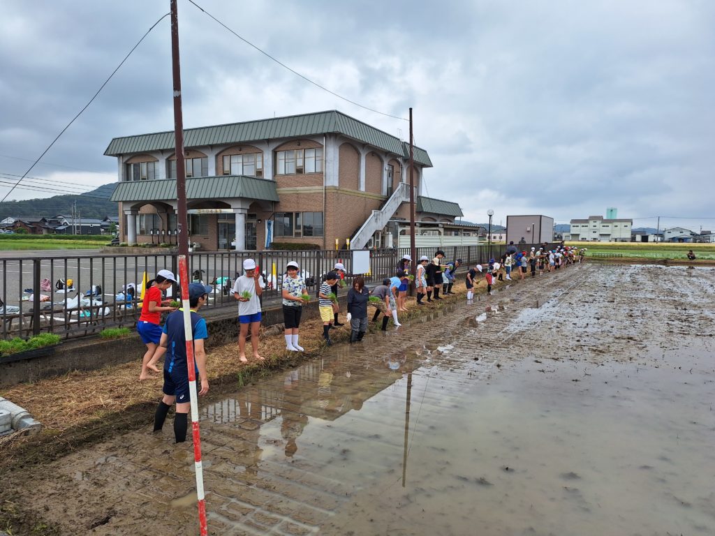 JAの皆さんにお世話になって、5年生が田植えを行いました。場所は公民館横のなかよし田んぼです。