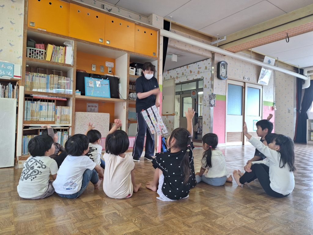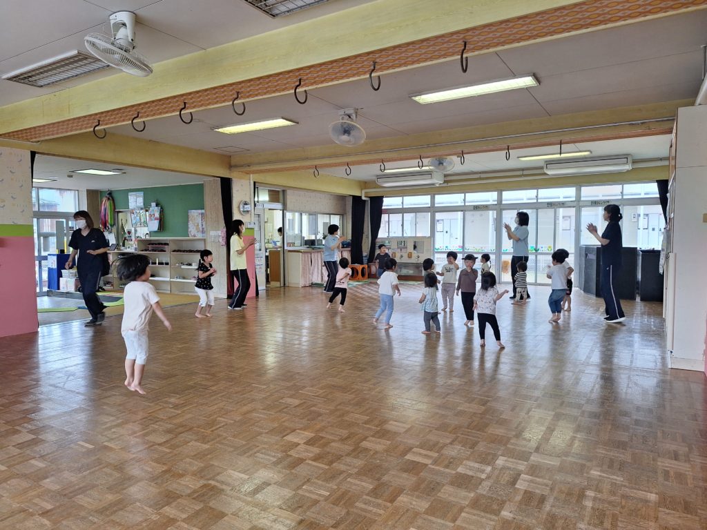 本校区にある福井市立の麻生津こども園に行ってきました。月曜日の朝ですが、一人ひとりの子どもが穏やかに活動を始めています。3歳から5歳までの子どもたちの集まりに、後半は0~2歳児のみんなも合流していきます。
