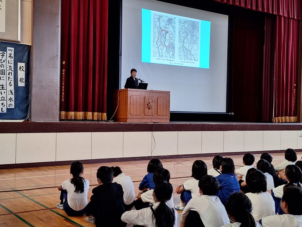 本校の東校庭の近くに、川を改修した証となる記念碑があることも全校の子どもたちに伝えました。治水も利水も、環境を守ることも、全て私たちの命とつながっています。未来を拓く子どもたちが、麻生津の歴史の深さから学んでいってほしいと思います。