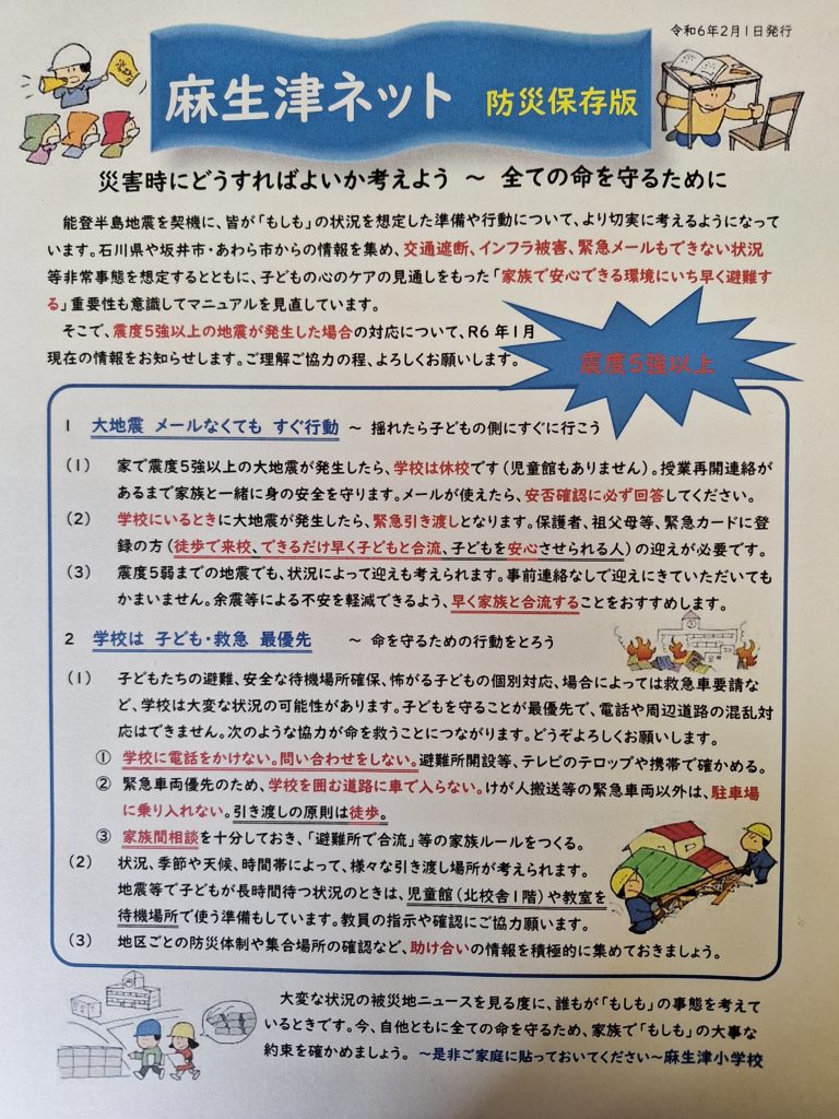 今朝も石川県能登地方で震度5強を観測する地震がありました。福井県嶺北でも最大震度3を観測しています。震度3は、休校や引き渡しにはなりませんが、もし、地域で震度5強以上となった場合は、緊急メールがなくても、休校になったり引き渡しになったりします。今一度、家族や地域での対応を確認しておきましょう。