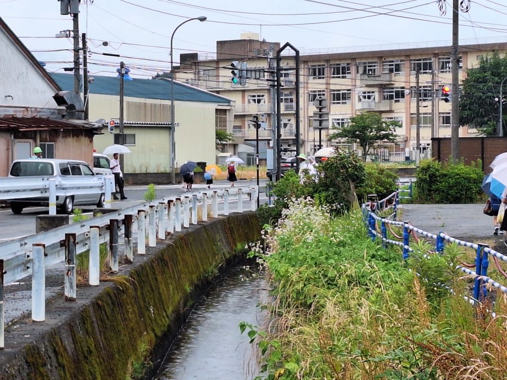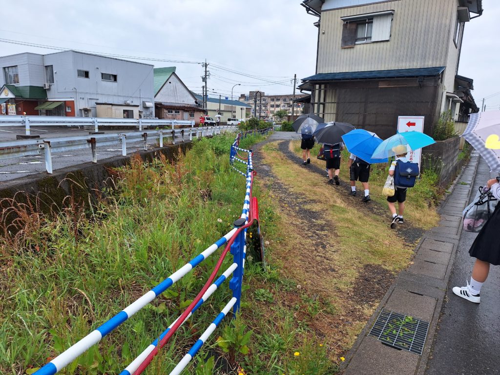 歩道橋の通行止めに伴う通学路変更。県道から東側に居住する子どもたちは、信号のないところ、信号のあるところ両方の道を横切ることになります。警察官の方、補助員さんたち、見守り隊の方も立って誘導してくださり、地域の地権者さんの許可で私有地も通らせてもらう場所もあり、安全な登下校を支えていただいています。