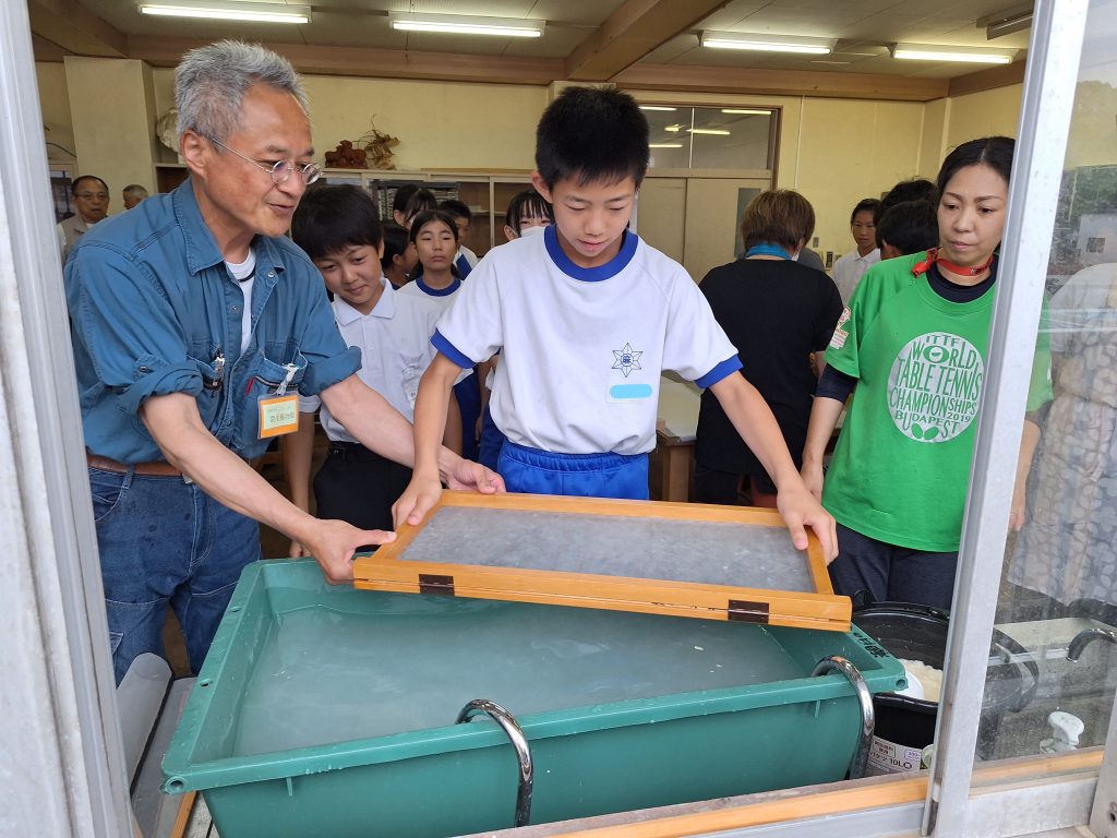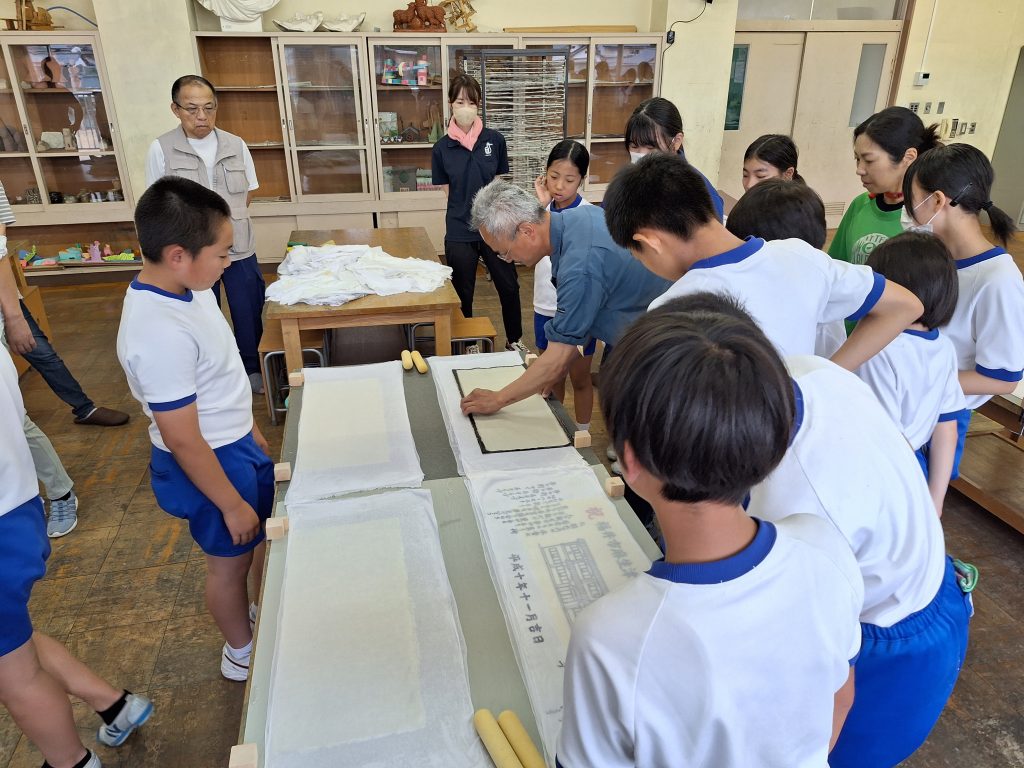 卯立の工芸館の伝統工芸士の方々もお越しくださり、和紙の秘密や活用、リサイクルなど、たくさんのお話もいただきました。洋紙と和紙の違いを子ども同士の綱引きで実感する方法では、子どもたちが目を輝かせました。和紙の貴重さや強さなど、心に残ったことと思います。