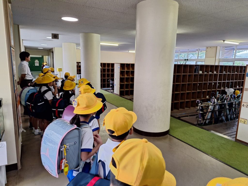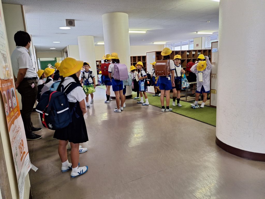 あいにくの雨ですが、児童玄関で1年生があいさつ運動をしています。わずかな時間ですが、登校した子から、元気な「おはようございます」と声を出しています。