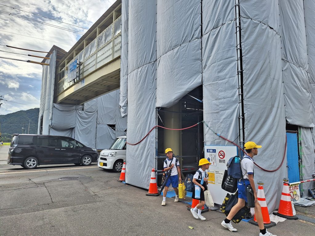 学校前の歩道橋は階段部分の修繕が終わり、通れるようになりました。通学路変更も解除され、いつも通りの道で登校できます。歩道橋の覆いがすべて取り外されるのは9月後半ですが、子どもたちは「きれいになった」と喜んでいます。地域の皆さんの働きかけや県のご支援、ありがとうございました。安全に気をつけて登下校したいと思います。ご支援ご協力よろしくお願いいたします。