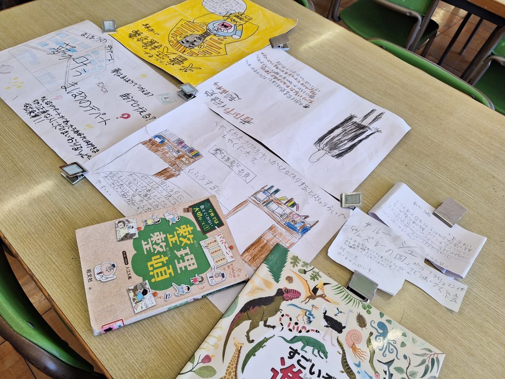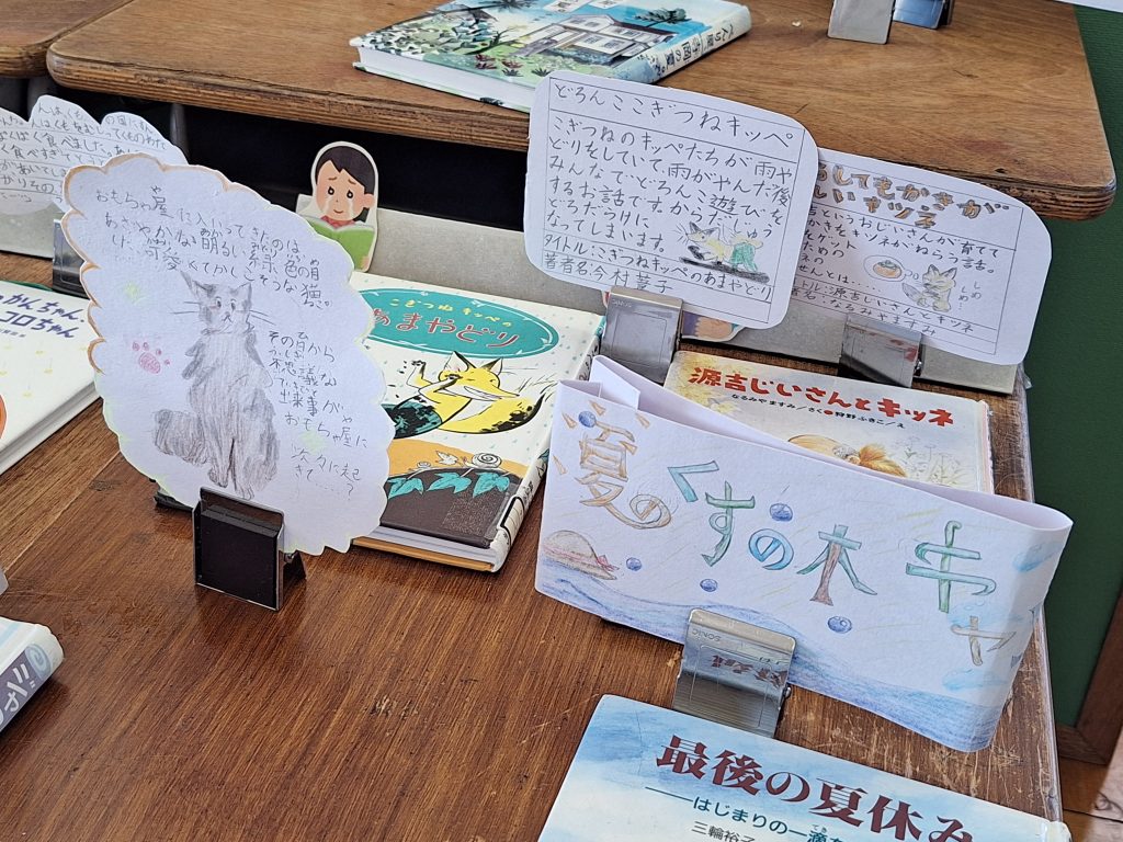 もう一つは図書室に並ぶ本紹介。本の帯やポスター、キャッチフレーズなど、どうよさを伝えるかを考え伝えようとしています。子どもなりの発想やコメントが、とても素敵です。
