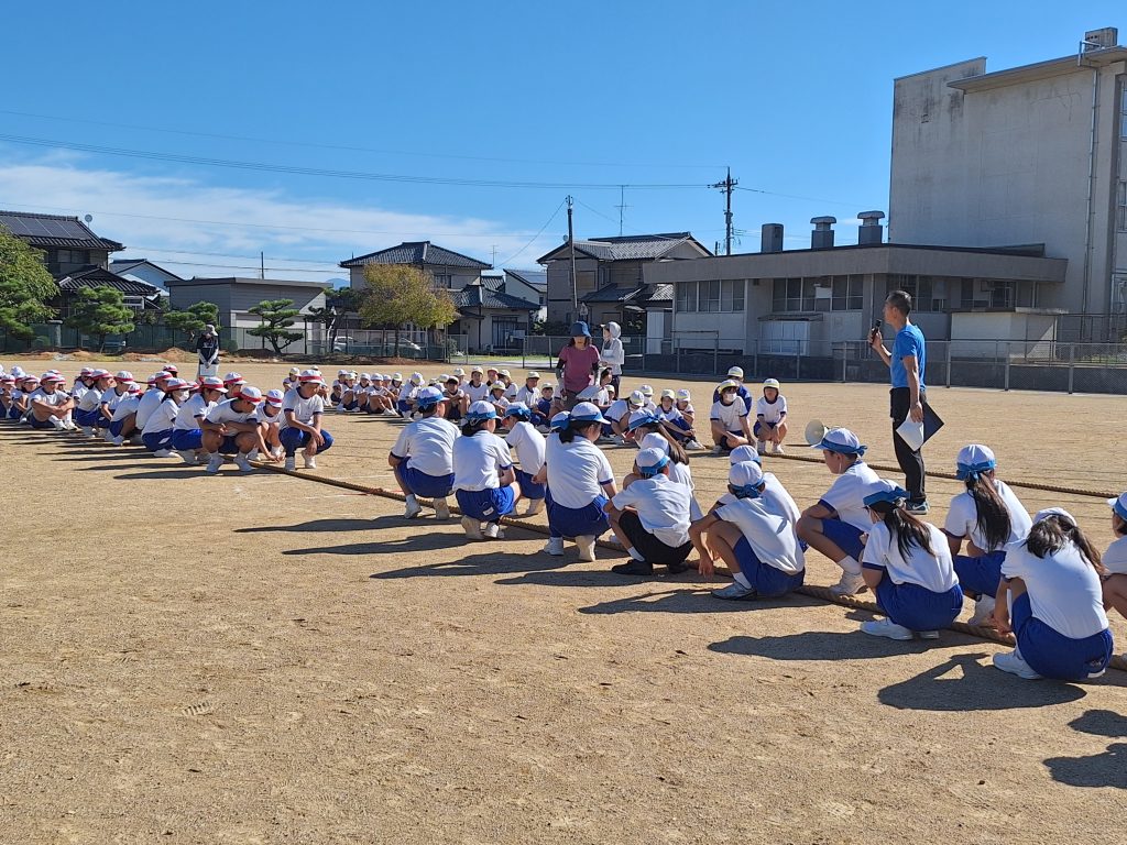 4年以上の高学年の練習日。3色に分かれての綱引き練習と、リレー練習を同時にしています。それぞれ自分の力を出して、チームが勝ってほしいと願いを込めた練習です。