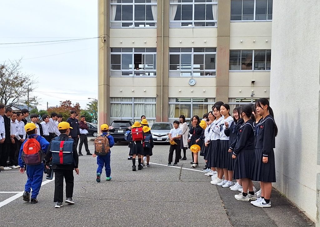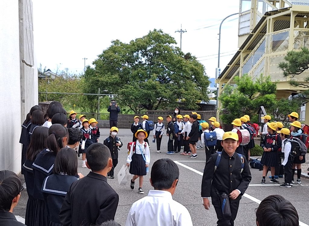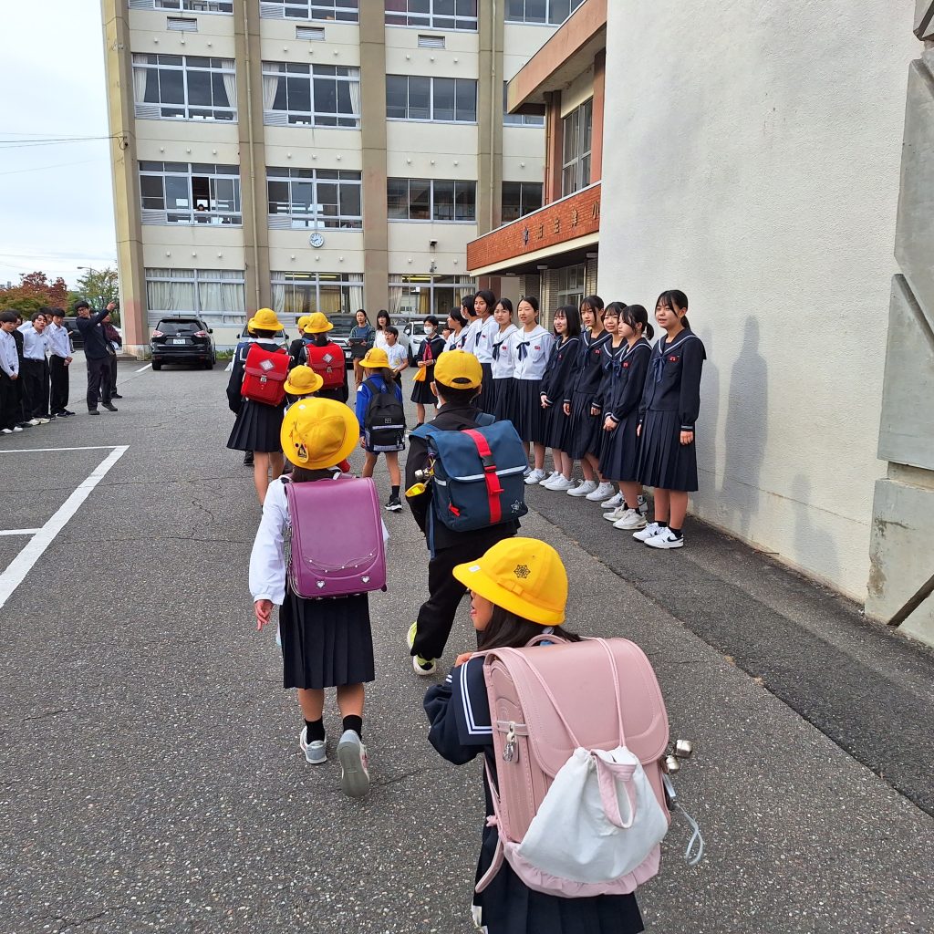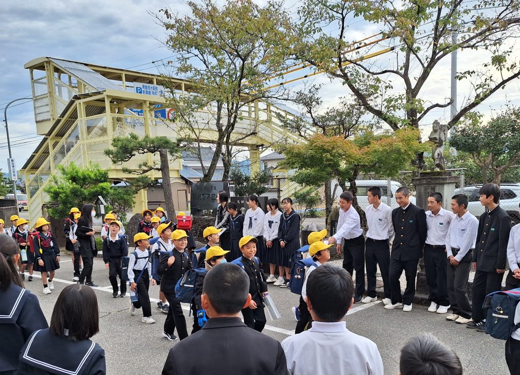 母校の小学校であいさつ運動をしてくれているのは、足羽中学校の3年生、2年生です。ずいぶん大きく立派になりました。小学生のみんなも少し恥ずかしそうですが、とても嬉しそうな表情です。小学生も出てきて、一緒にあいさつ運動をしています。