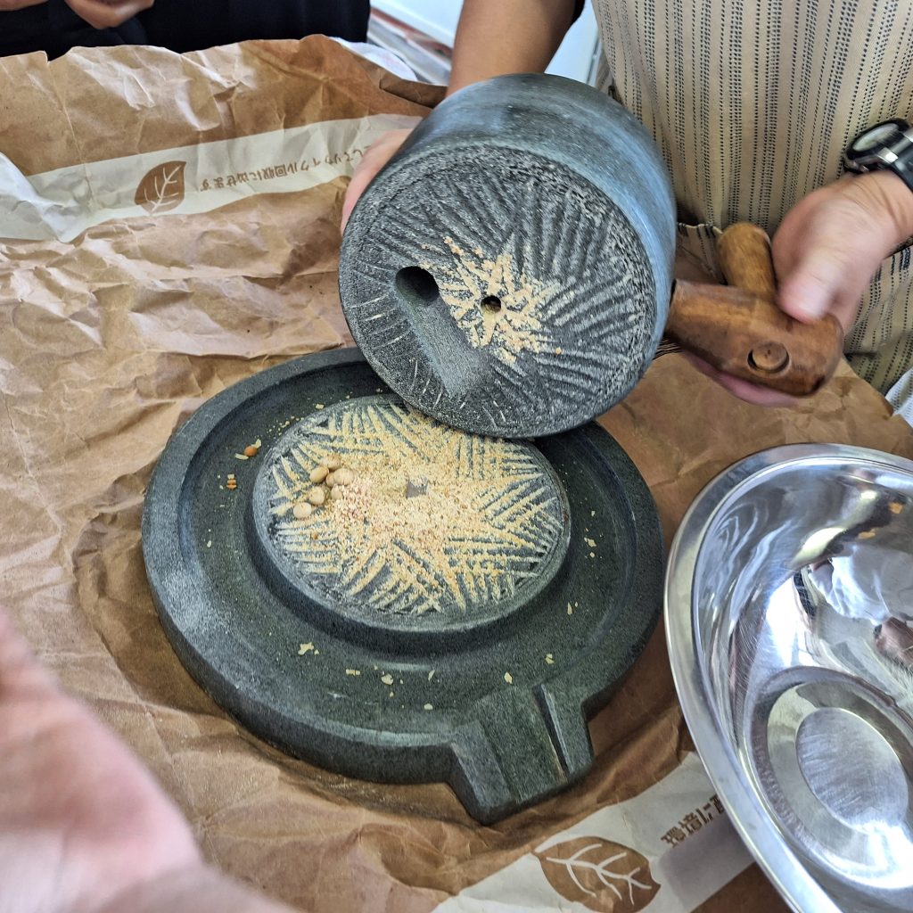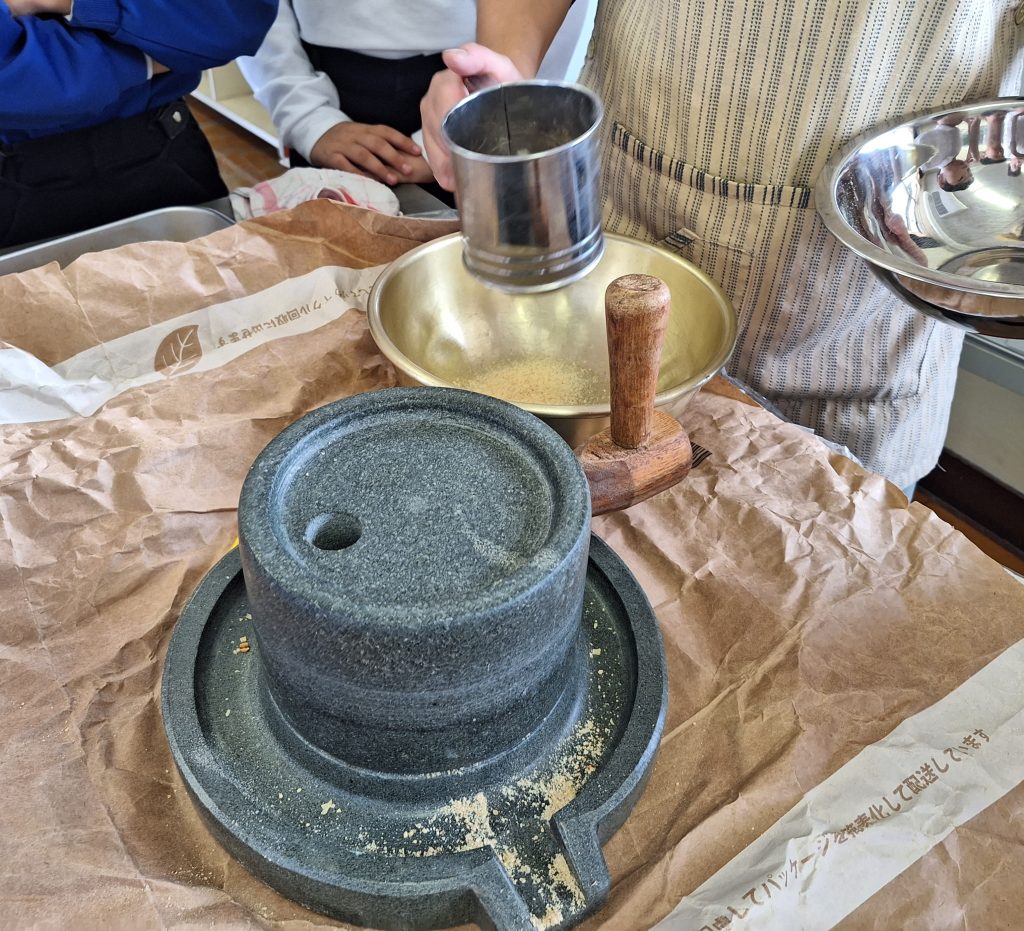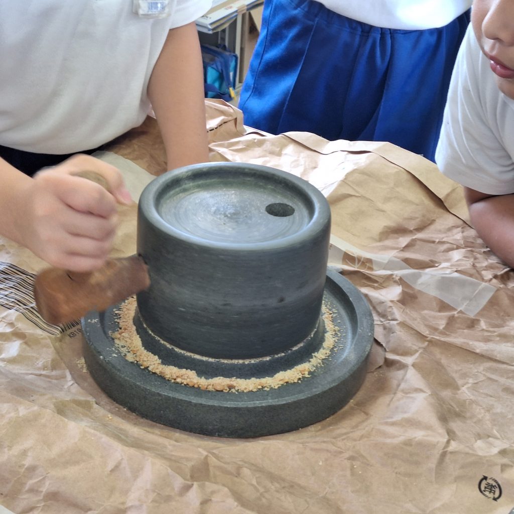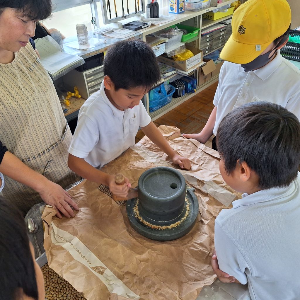 子どもたちが身を乗り出しているのは、きなこ作り。畑で大豆も育て、煎った大豆を本格的に石臼できなこにしています。あたりに、豆を潰した甘いにおいが広がります。