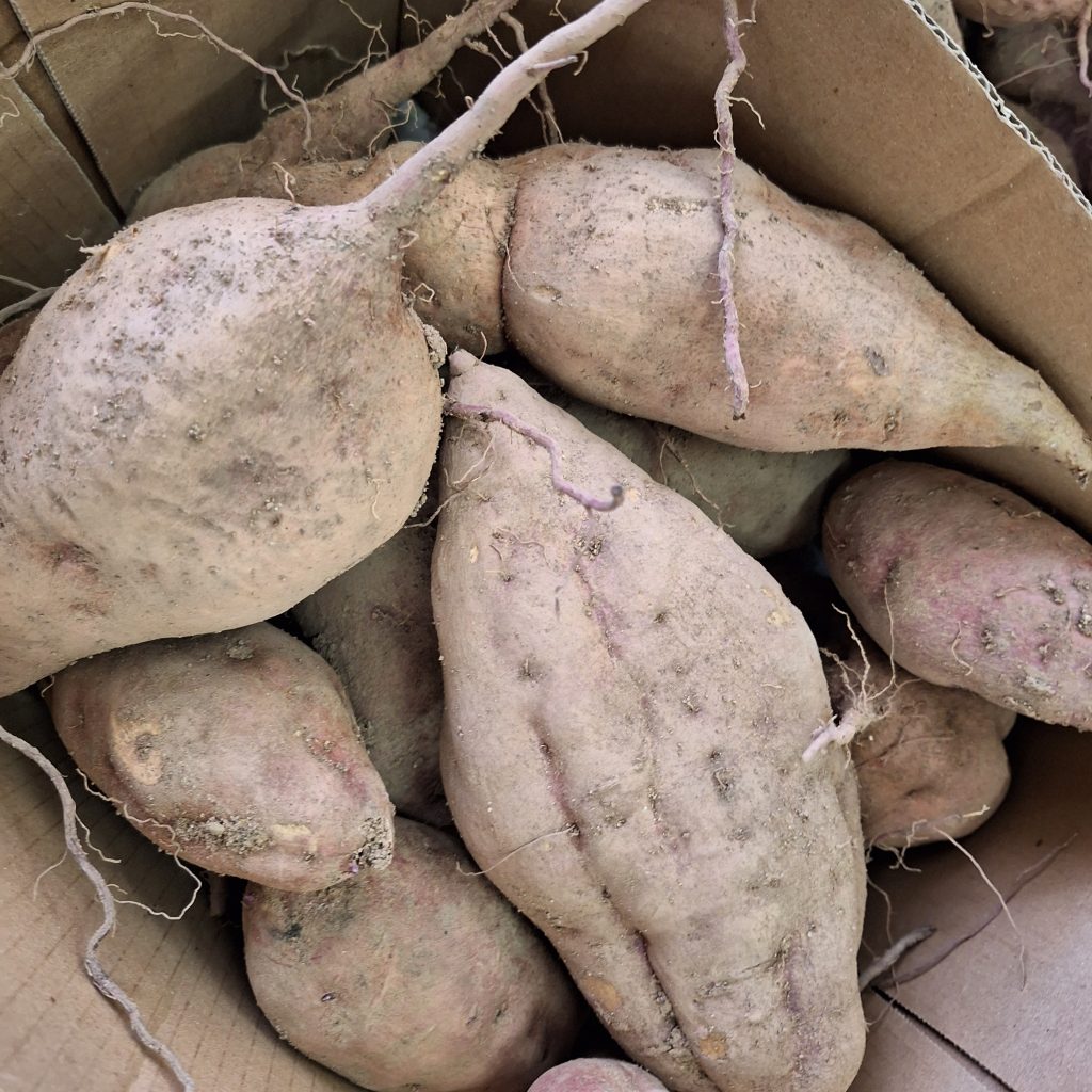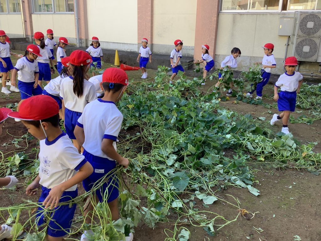 1年生が中庭の畑で育てたサツマイモ。長くて丈夫なつるを引っ張って、大きくて立派なサツマイモを掘ることができました。
