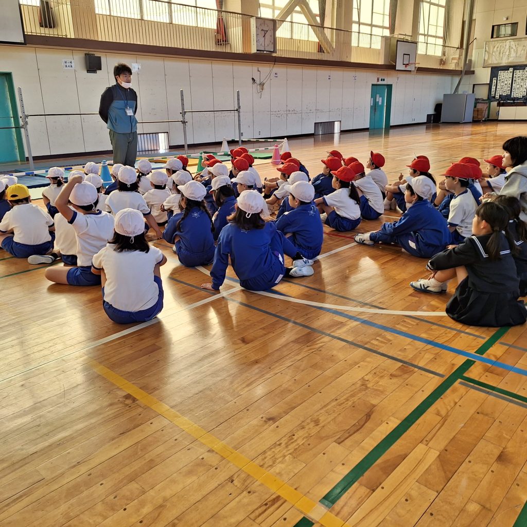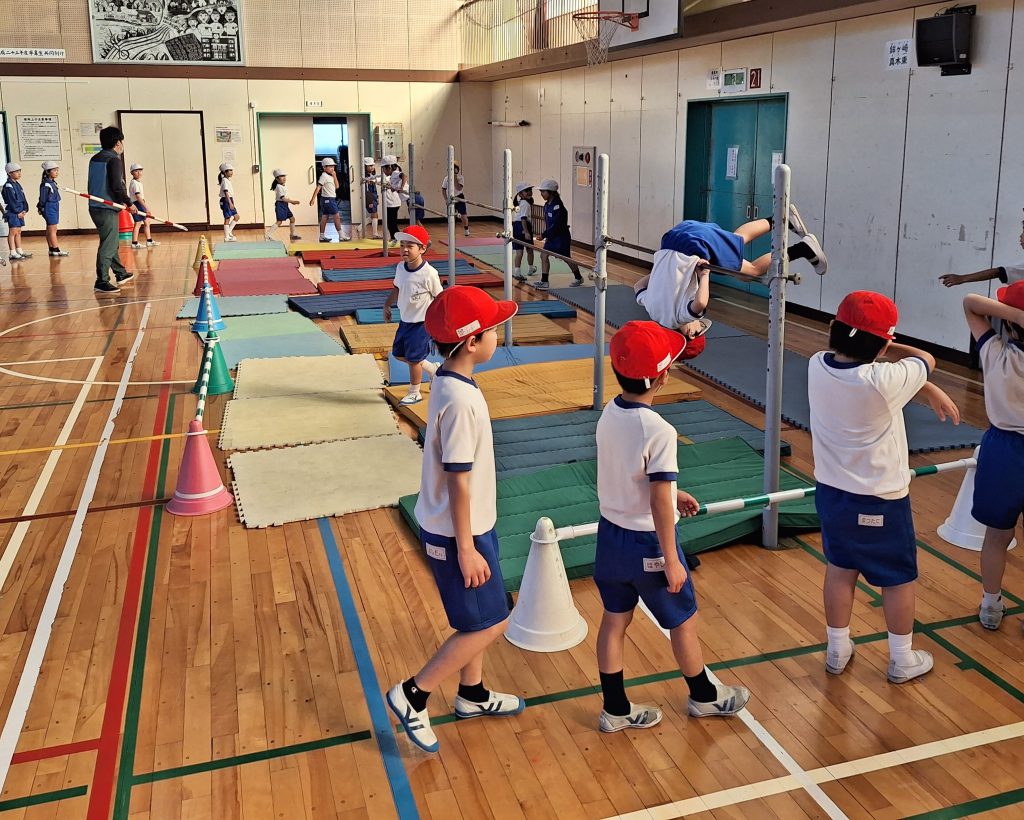 体育館に鉄棒を設置しました。全校児童が使います。授業だけでなく、休み時間にも親しめるよう、鉄棒を使うときのルールを1年生みんなが共有しています。