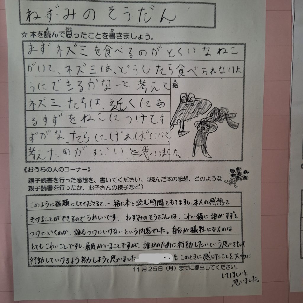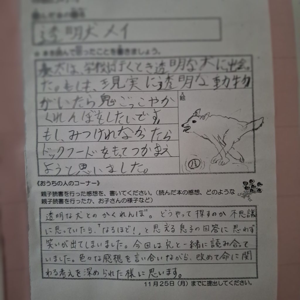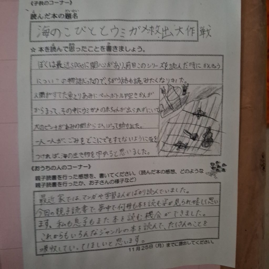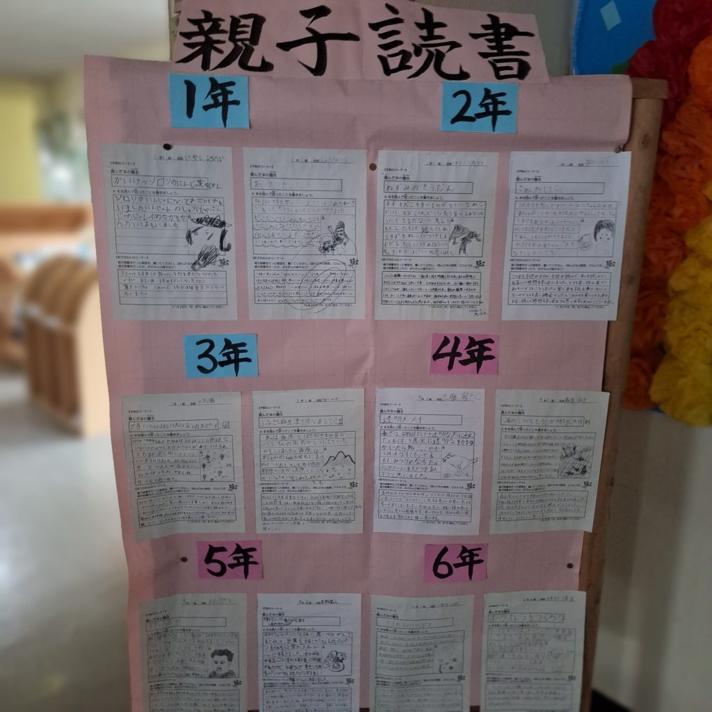 本校が読書活動で文部科学大臣表彰をいただいたのは、平成28年のことです。子どもたちはみごとにタブレット等に適応する時代ですが、読書活動で得られる豊かさはとても大事なものです。毎年行う親子読書。保護者の皆様から心温まるメッセージを書いていただき、子どもたちの読書意欲もぐんと上がります。ご協力いただきありがとうございます。これから寒い時期、是非ご家庭でも読書を続けていきましょう。