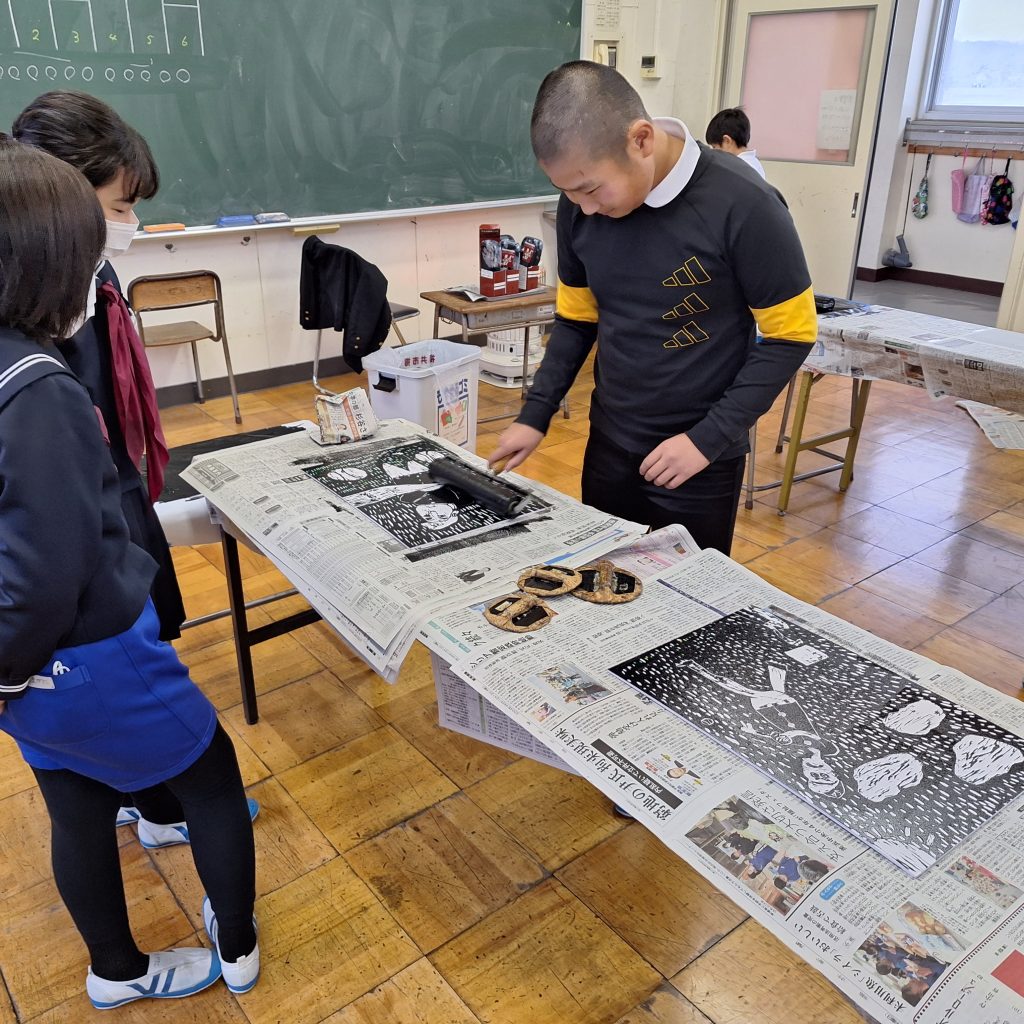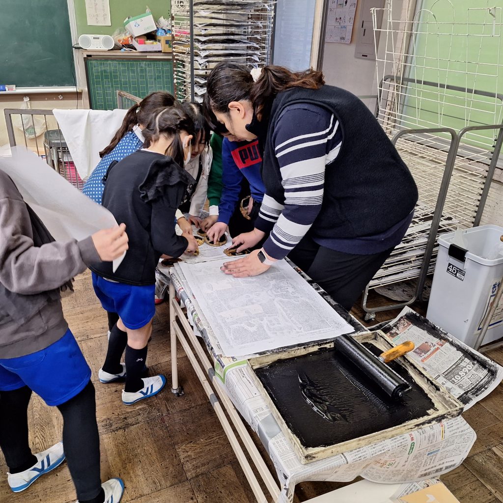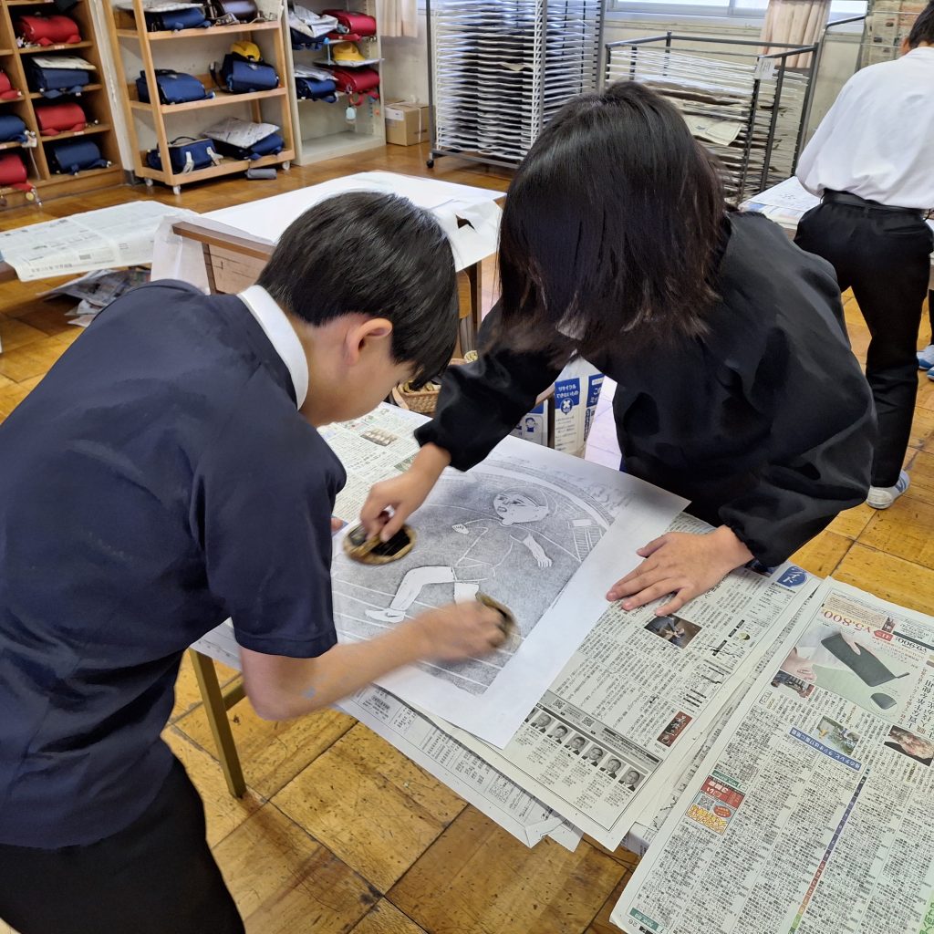 版画の仕上げに一生懸命なのは、5年生と2年生です。個人の作品作りだけでなく、協力して仕上げることや、作品を鑑賞し合うことなど、友達同士の協力や交流が欠かせない学習です。学級のなかまと関わりも深まった今、お互いに作品を真ん中にして大事そうに協力し合う姿はいいものです。きっと素敵な作品に仕上がっていると思います。