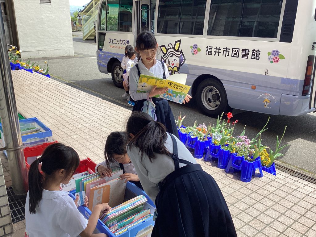 久しぶりに福井市図書館のフェニックス号がやってきました!「どの本にしようかなあ」と言いながら、子供たちは、いろいろな本を手に取っています。紙芝居も人気です。教室で時間があるときに読んでくださいね。
