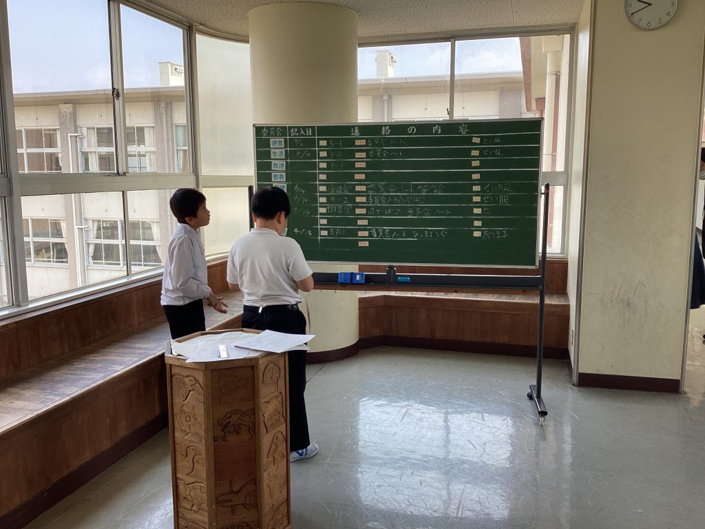 麻生津小学校の2階大ホールの前に委員会黒板があります。委員長さんたちが、随時連絡を書いてくれています。6年生はリーダーとして、委員会以外にも、掃除・集団登校・縦割り班の班長などを務めていて、本当によくがんばってくれています。
