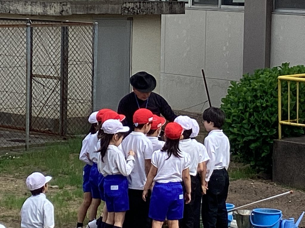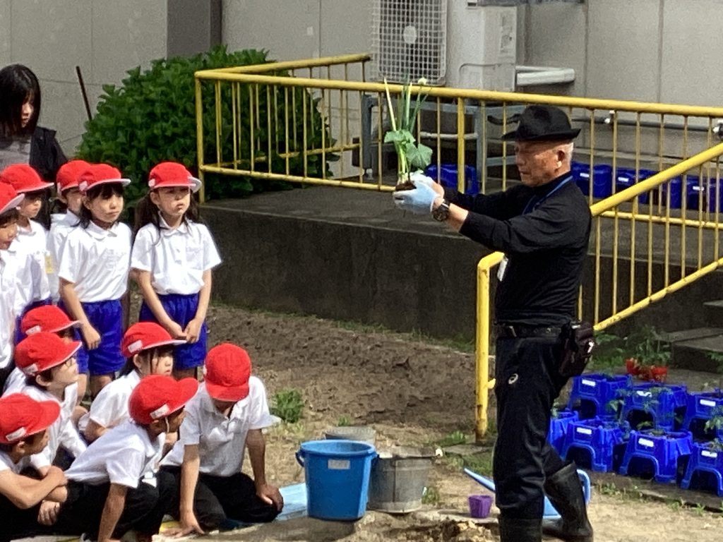 2年生が生活科で野菜づくりに挑戦します。自分が育てたい野菜の苗を植えます。ナス・キュウリ・トマトです。あそうづ見守り隊の山腰稔様が教えに来てくださいました。山腰さんからは「コンパニオンプランツ」という言葉を教えていただきました。山腰さんは「野菜が病気にならないようにするために、キュウリにはネギ、トマトにはニラを一緒に植えると悪い菌をやっつけてくれる」と話してくださいました。子供たちは興味津々で山腰さんの植えている様子を見ていました。そして、いよいよ自分たちの番になると「病気にならないでね」という思いをこめて丁寧に植えていました。収穫が楽しみです。山腰様、ありがとうございました。