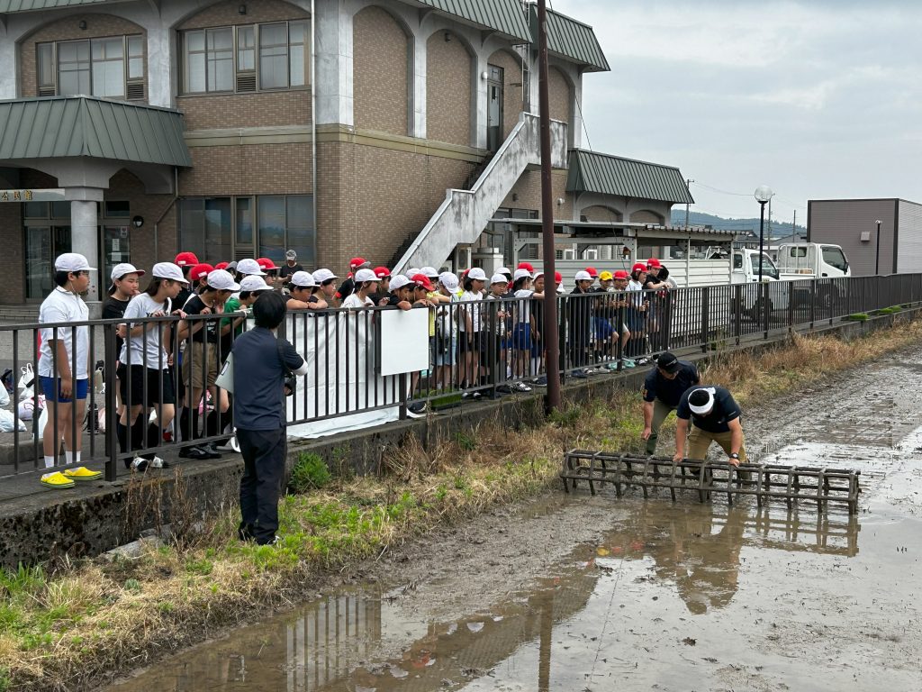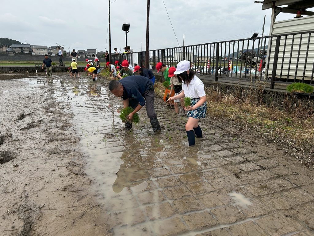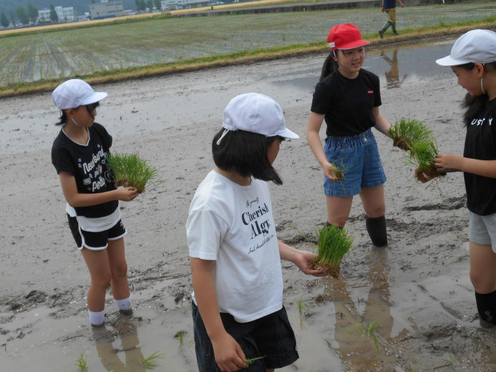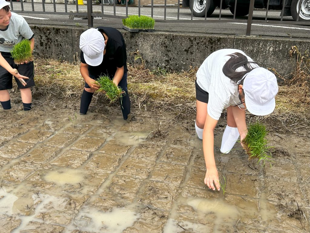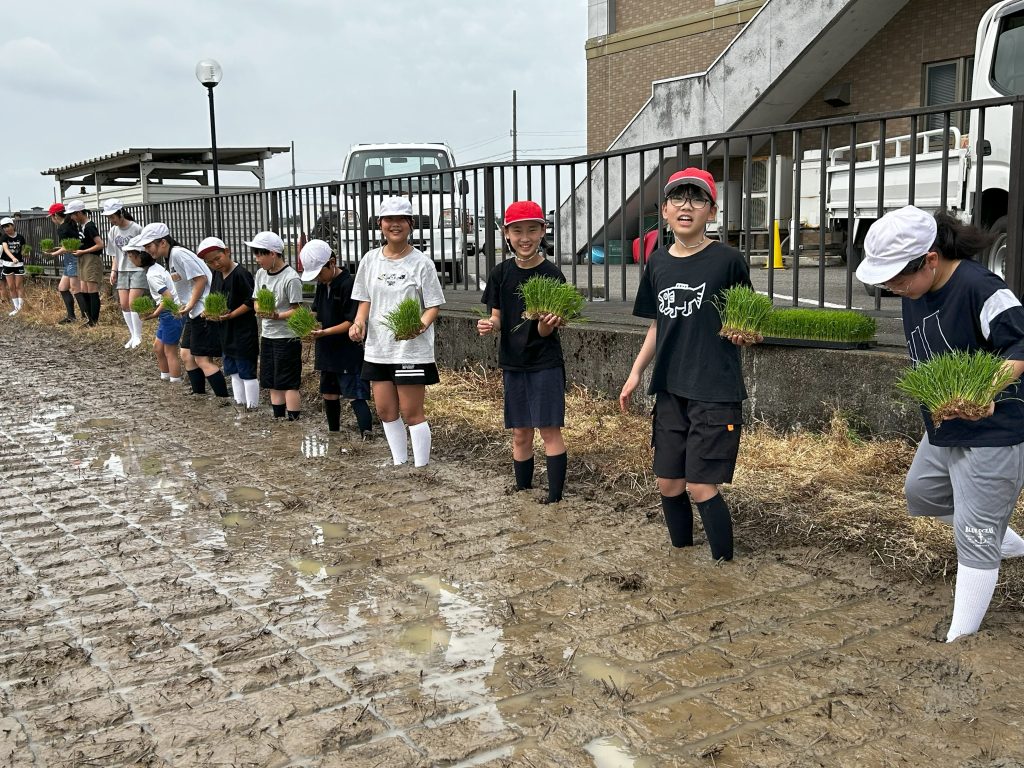 JAのみなさんにお世話になって、5年生が田植えを行いました。場所は、公民館横のなかよし田んぼです。田植えに行く前には、気乗りのしない様子も見られましたが、いざ始まってみたら、楽しくてたまらないという感じでした。田んぼの土に足を入れた瞬間、「つめたっ!」「ぬるぬる~」表情が緩んでいました。五感で感じる田植えは、学校内で想像するのとは全く違います。「こんなに大変で難しいんだあ」「お米作りする人、すごいなあ」心からそう感じていました。JAの皆様はじめ、地域の方たちのおかげで、有意義な活動となりました。ありがとうございました。
