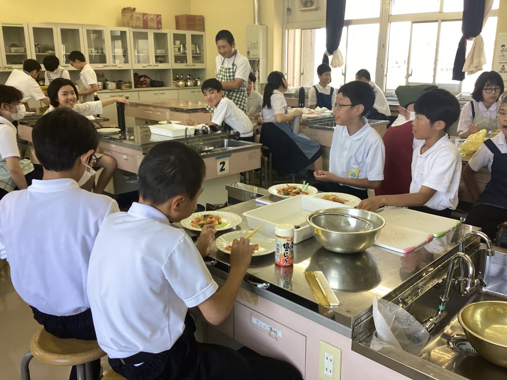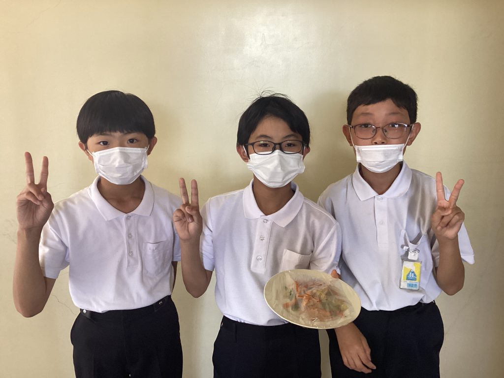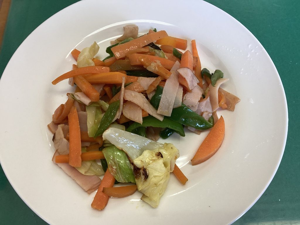 6年生の男子3名が、家庭科の調理実習で作った「野菜いため」を校長室に持ってきてくれました!埃が入らないようにサランラップをしてくれる気遣いまで感じられました。ラップを取ると、香ばしい香りがぷーんとしてきました。皿の上に盛り付けられた野菜いための彩りのいいこと。オレンジやピンク、緑や黄緑と、見た目も楽しめます。にんじんやキャベツ、ピーマンやハムが同じような大きさに切られていて、とっても食べやすかったです。塩加減も辛すぎず薄すぎずでちょうどいい!炒め方もシャキシャキ感が残っていて、食べると野菜その物の味が感じられ、甘みもあって、とてもおいしく頂きました。ごちそうさまでした!