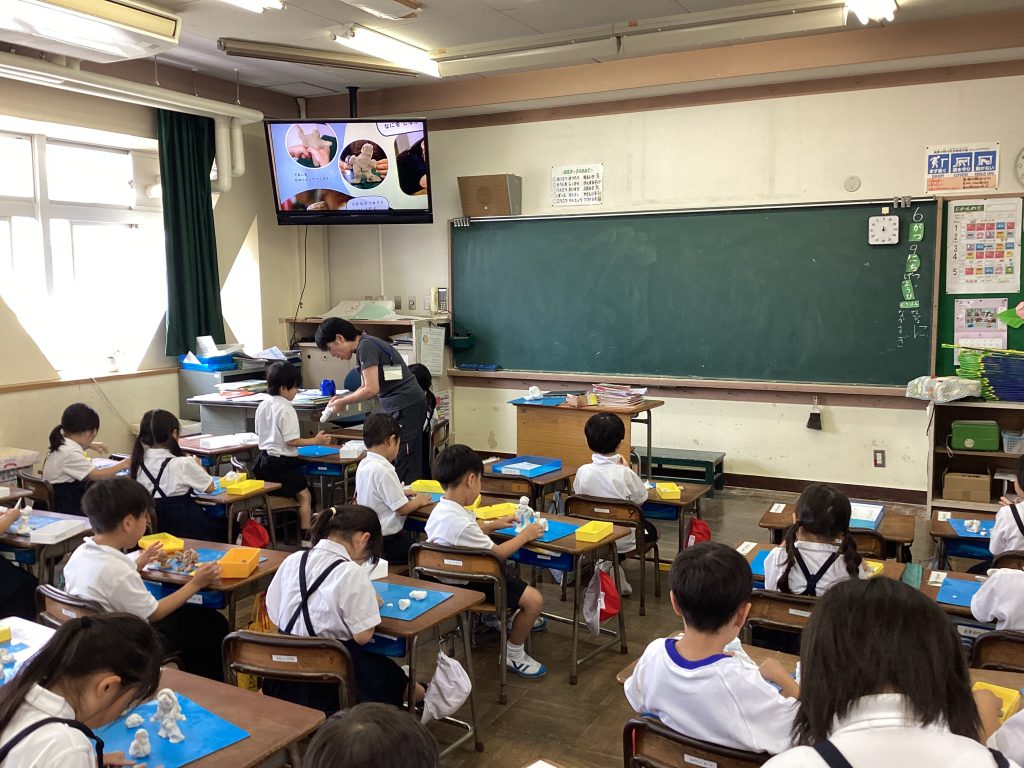 図工の授業をのぞいてみました。教室に入った瞬間、つくるのに没頭している子供たちの雰囲気に圧倒されました。見せたくて仕方のない子、友達の作品を見に行く子、自分の作品を見せている子、もくもくと作っている子、粘土の形をひねってくっつけている子。一人一人があれやこれやと考え、学びがいっぱいです。工夫したことが全て作品にあらわれます!できあがりを楽しみにしていますよ。