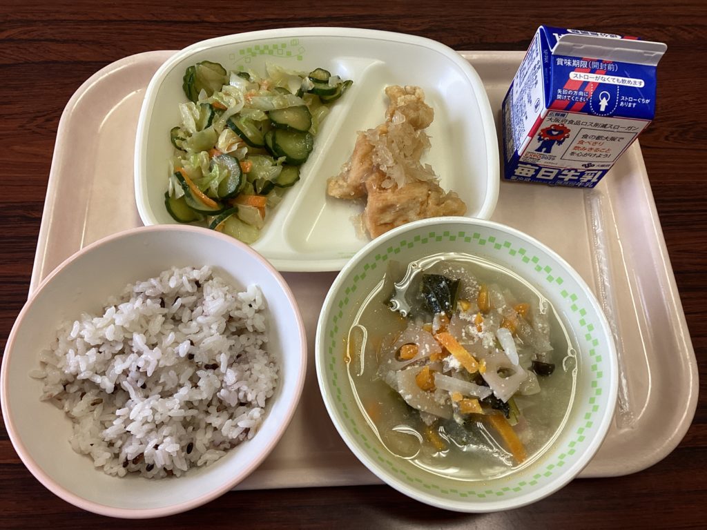 「牛乳・古代米ごはん・鶏肉のらっきょうからめ・野菜サラダ・呉の野菜スープ」です。古代米は、栄養たっぷりです。「いつもと違って香ばしい」「かりっとする」と子供たちは言っていました。味や香り、食感も楽しめた給食です。