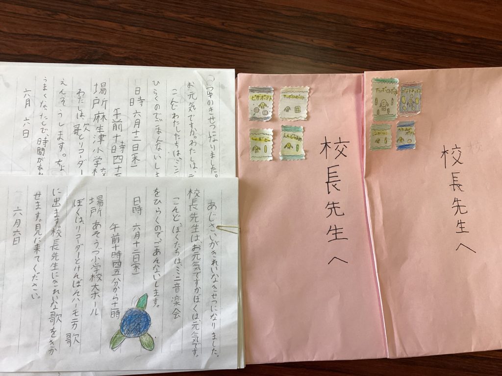 3年生が、ミニ音楽会に招待してくれました。全員の招待状を見ると、時候の挨拶から考えられていて「夏がちかづいてきました」「あじさいの花がさくようになりました」など、たくさん素敵な言葉がありました。リコーダーを学習するのは3年生からです。ですが「あ~したてんきにな~れ」のタンギングは見事でした。けんばんハーモニカと歌の重なりもきれいなハーモニーでした。できる楽器が増えていくと、音楽がますます楽しみになりますね。