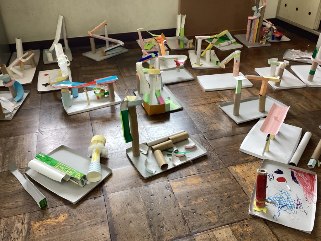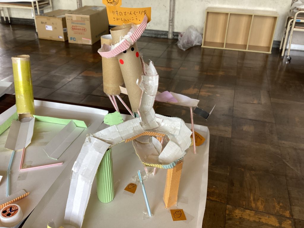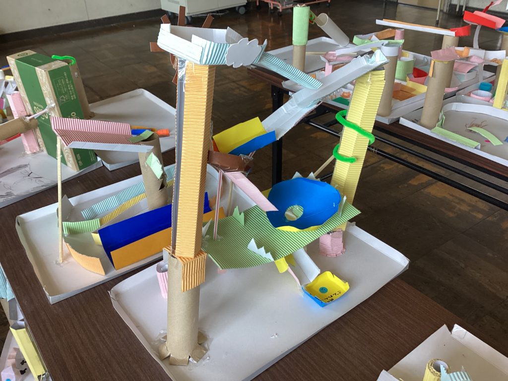 身近な材を使った4年生の作品、完成です。トイレットペーパーの芯やサランラップの箱、紙コップや段ボールなど、自分でイメージしてビー玉の動きを考えながらつくりあげた作品です。アイディアがいっぱいですね。楽しそうに作っているのが伝わってきます。色鮮やかで、まるでミニ遊園地のようです。滑り台やジェットコースター、迷路やトンネルなど、たくさんのおもしろい動きが想像できます。ビー玉が動いている様子を見ながら修正していく子もいるかもしれません。友達の動きを見て修正する子もいるかもしれません。その過程が重要です。子供たちが、自ら考え、試行錯誤しながら創り上げていく「図工の学びの楽しさ」が実感できる授業です。