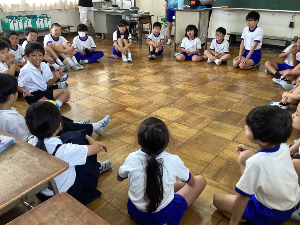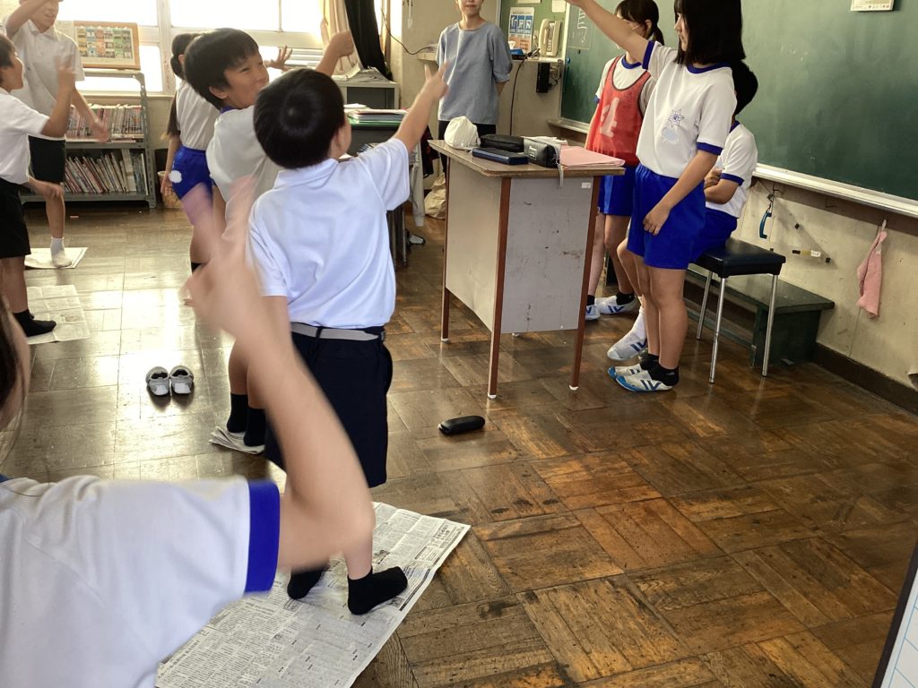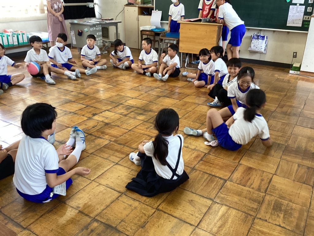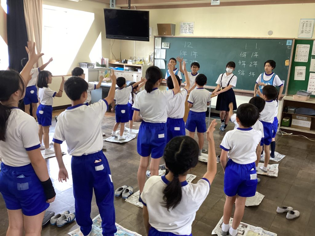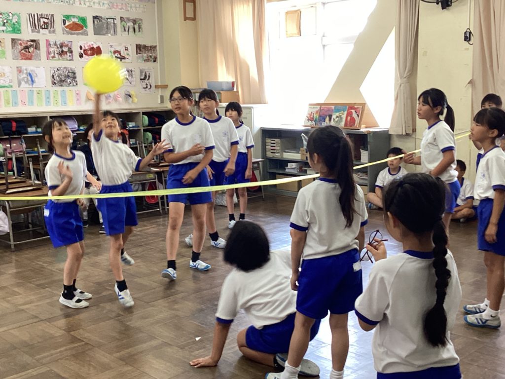 待ちに待ったたてわり活動。写真からもわかるように、みんなが笑顔で楽しんでいます。風船バレーや新聞紙ゲーム、ばくだんゲームなど様々です。6年生が下の学年を楽しませたいという優しい思いから考えてくれたゲームです。エアコンの効いた涼しい教室で、快適に楽しく遊んでいます。仲がぐっと深まっていました。
