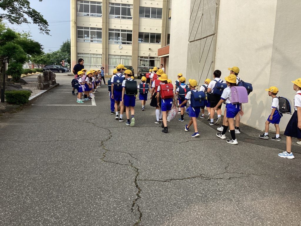 児童玄関前に1年生がずらっと並んでいます。「おはようございます」元気な声が響き渡っています。1年生のあいさつは、全校に元気を与えてくれます。先生たちにも。4月に入学してきて3か月。とってもたくましくなりましたね。「あそうづっ子のめあて」の「あ」「あいさつ はつらつ 明るい子」そのままです。暑い中、ありがとう!1年生。