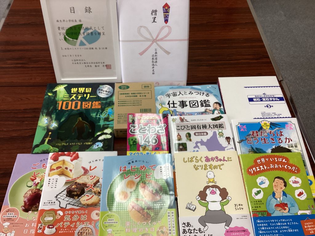 日本教育公務員弘済会福井支部様より、本校に、学校教育図書16冊を頂きました。6年生の児童が代表で頂きました。「世界のミステリー100図鑑」をはじめとして面白そうな本がいっぱいです。また、図書室に行く楽しみができましたね。日本教育公務員弘済会福井支部のみなさま、本当にありがとうございました。