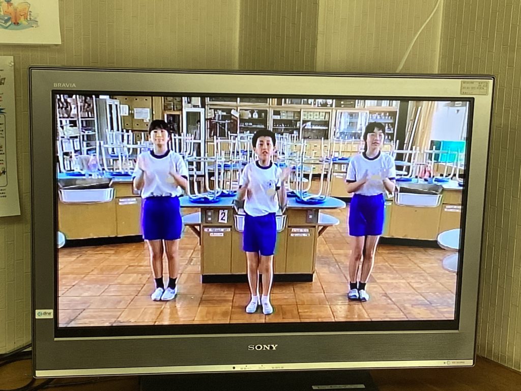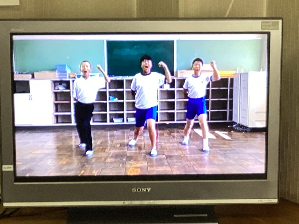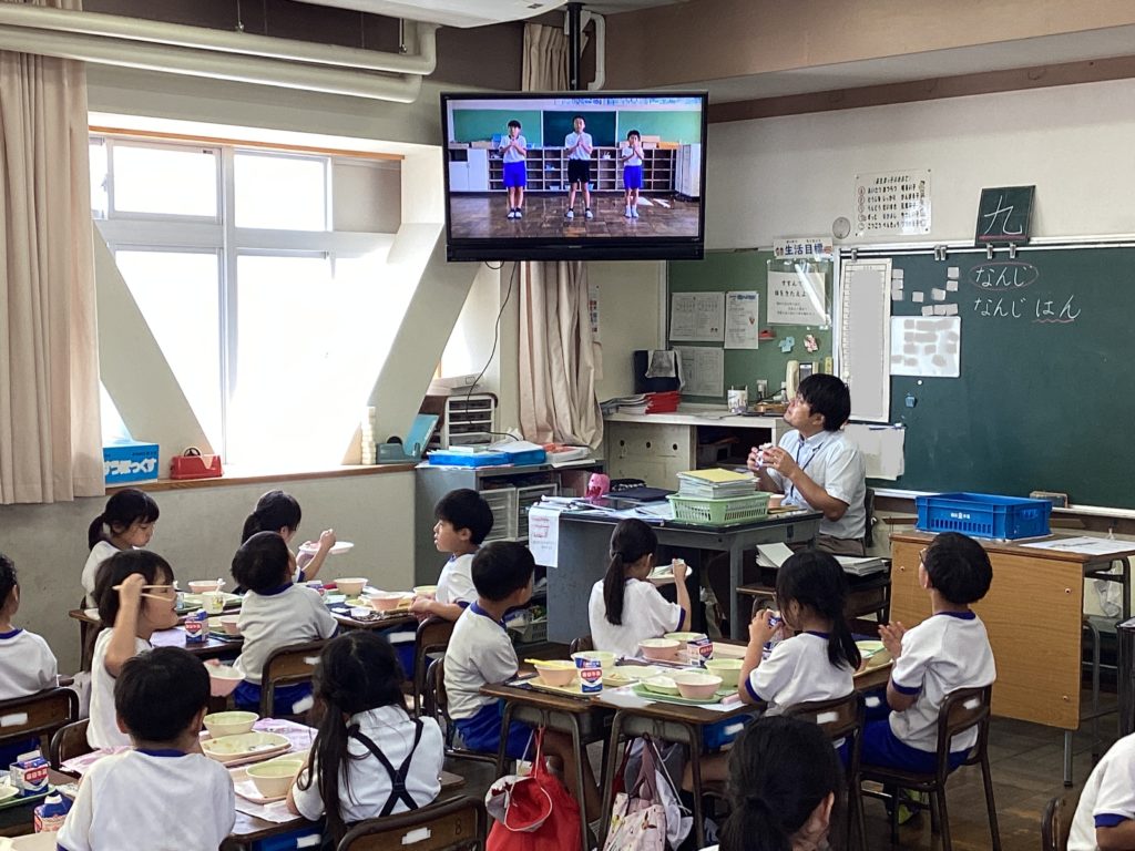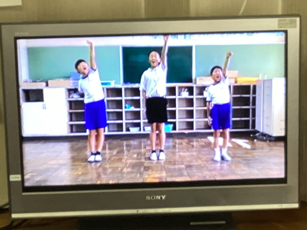 10月1日の体育大会に向けて、いよいよ始まります!給食中に、6年生が考えた応援の動画が流れてきました。楽しそうな音楽も聞こえてきます。1年生は、初めての麻生津小学校での体育大会なので、わくわくしながら見入っていました。中には手拍子をしながら見ている子もいます。憧れの6年生のお兄さん・お姉さんの応援や準備運動の動画を見て、いっそう、体育大会が待ち遠しくなったようです。