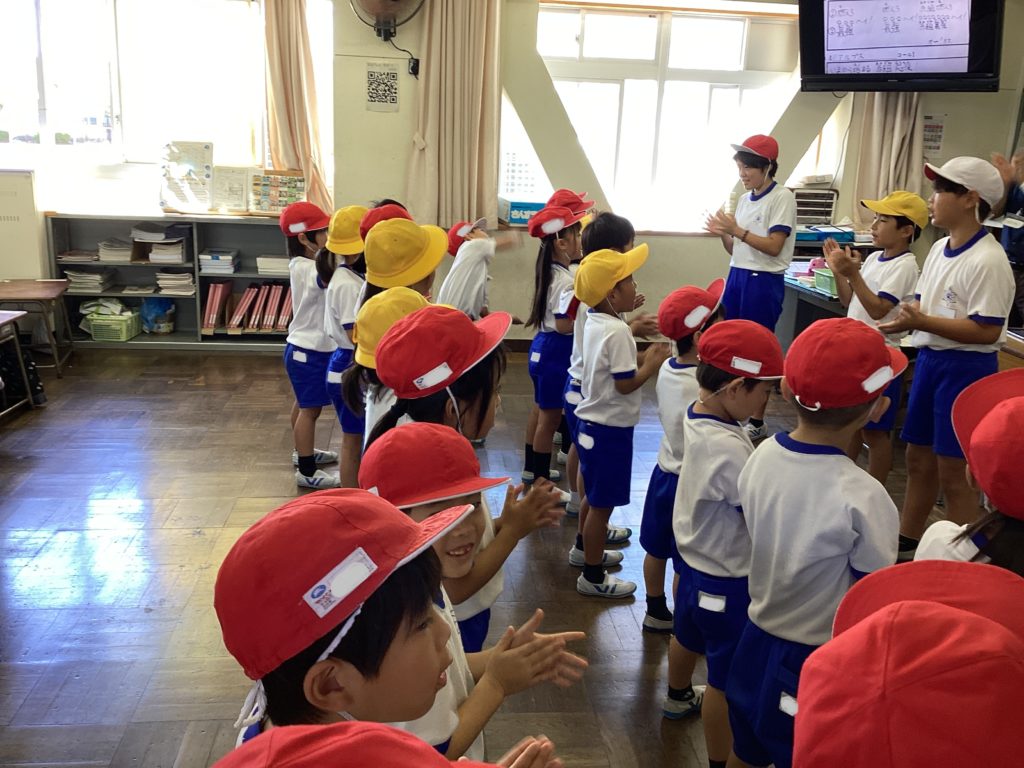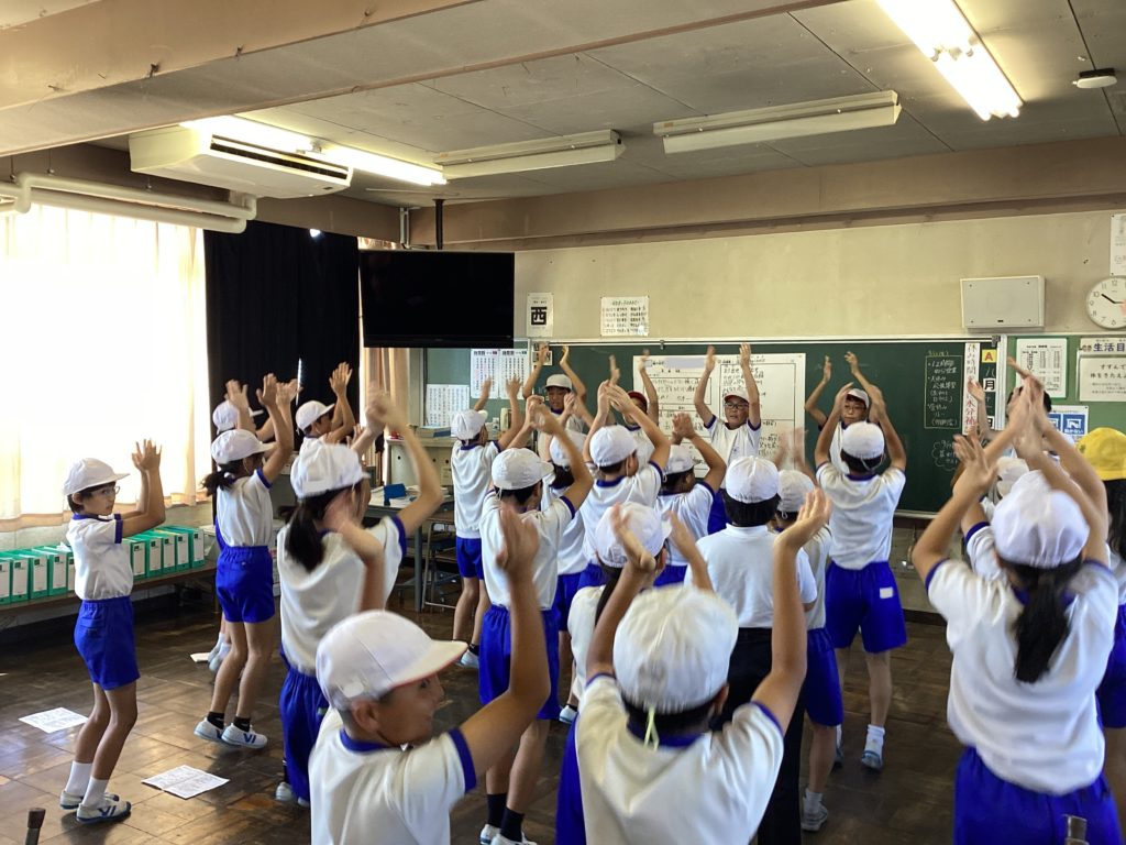 学校中に、応援の声が響き渡っています。いよいよ、今日から、縦割り班での練習がスタートしました。6年生が前に出て、優しく振り付けを教えています。テレビ画面を見せている班もあります。1年生も、初めての小学校の応援ですが、とっても張り切っています。1回目とは思えないほど、みんな声を張り上げて頑張っていました!