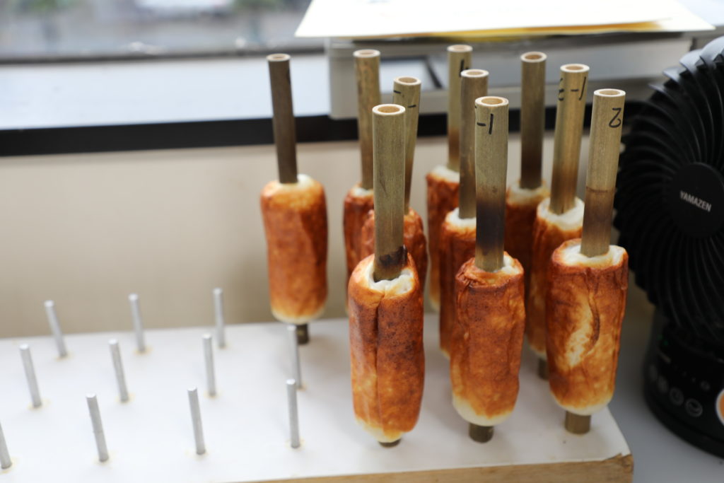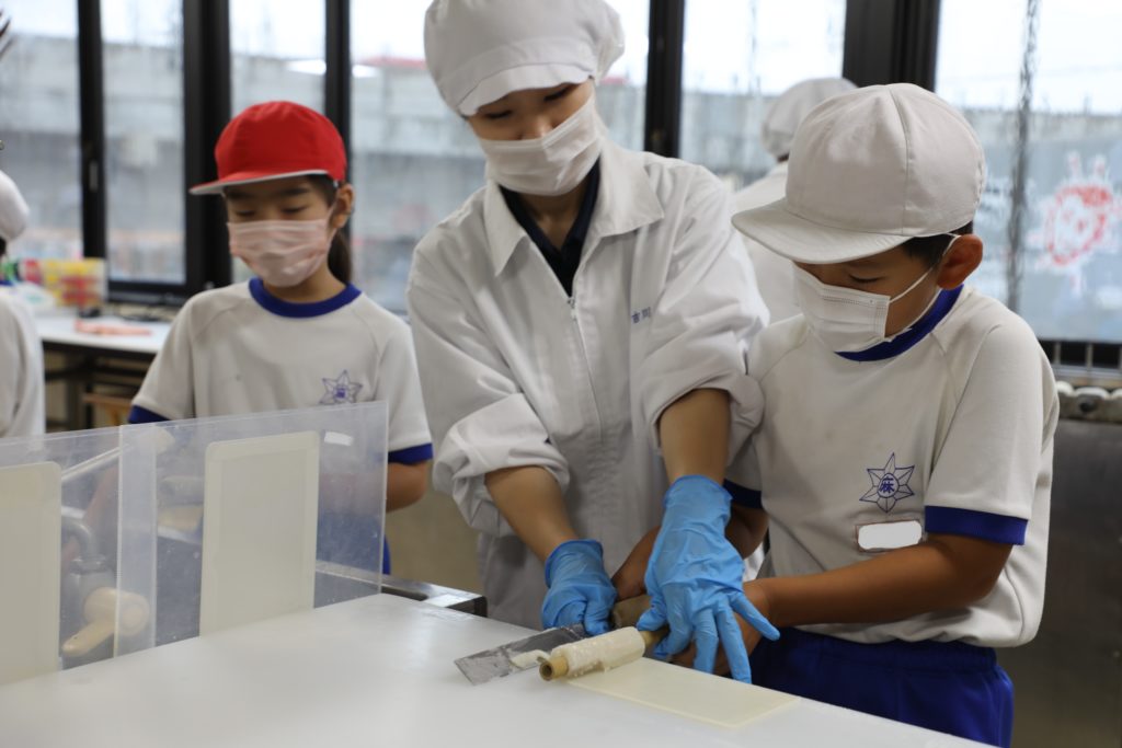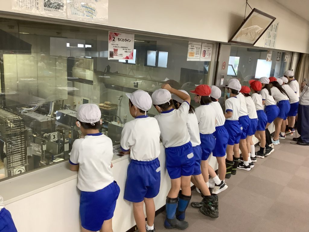 かまぼこ工場での大がかりな機械の様子を見て圧倒される子供たち。「普段食べているかまぼこがこんな工程で作られているんだ」と見入っていました。働いている方に仕事の工夫をお聞きした後、実際に作る体験ができました。できたての竹輪のいい香り。学校ではできない活動をたくさんすることができました。