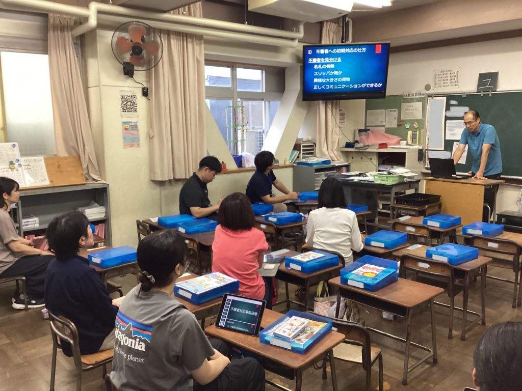児童の下校後、先生方は、日々、研修をしています。今日は、不審者対応訓練の事前研修です。担当の先生が、警察の方に教えていただいたことをもとに、研修を進めています。「さすまた」の場所を確認したり、もしもの場合を想定してイメージトレーニングしたり、実際に「さすまた」を使ってみたりと、先生方は、熱心に話し合いながら行っていました。子供たちが、安全で安心な学校生活を送ることができるように、しっかりと努めていきたいと思います。