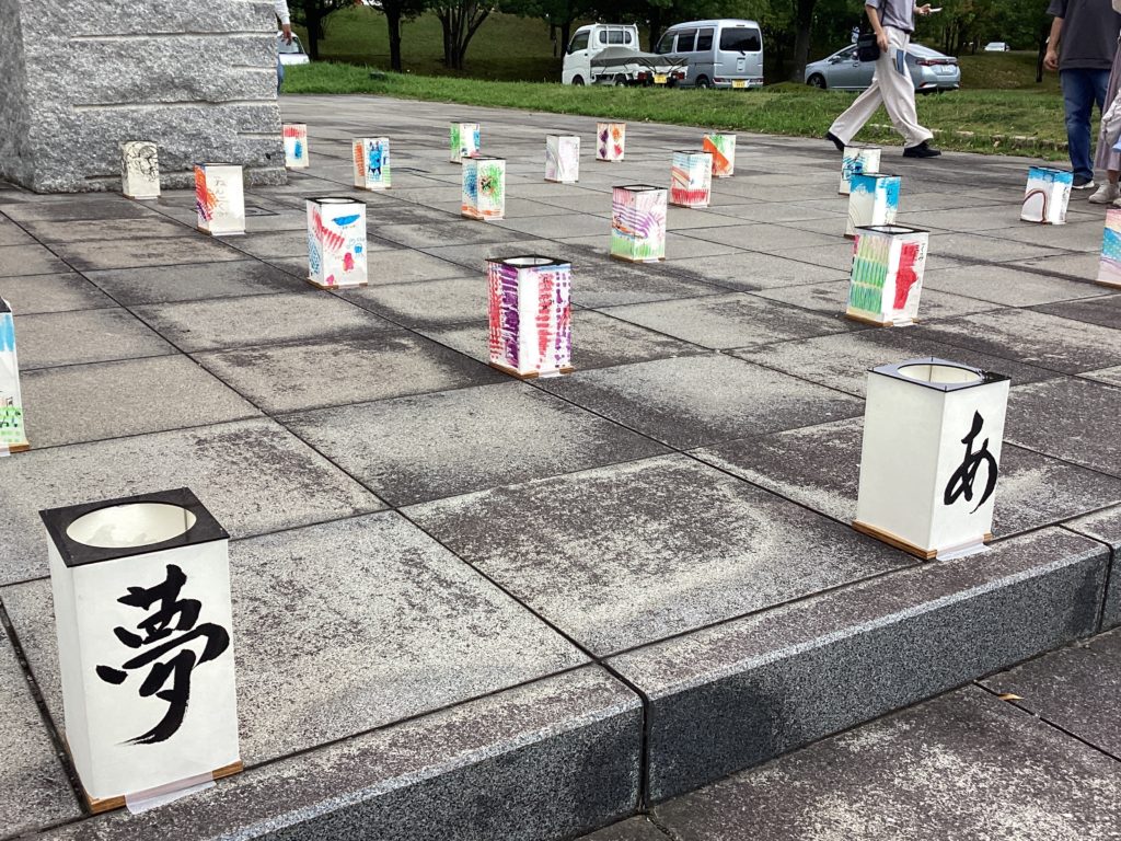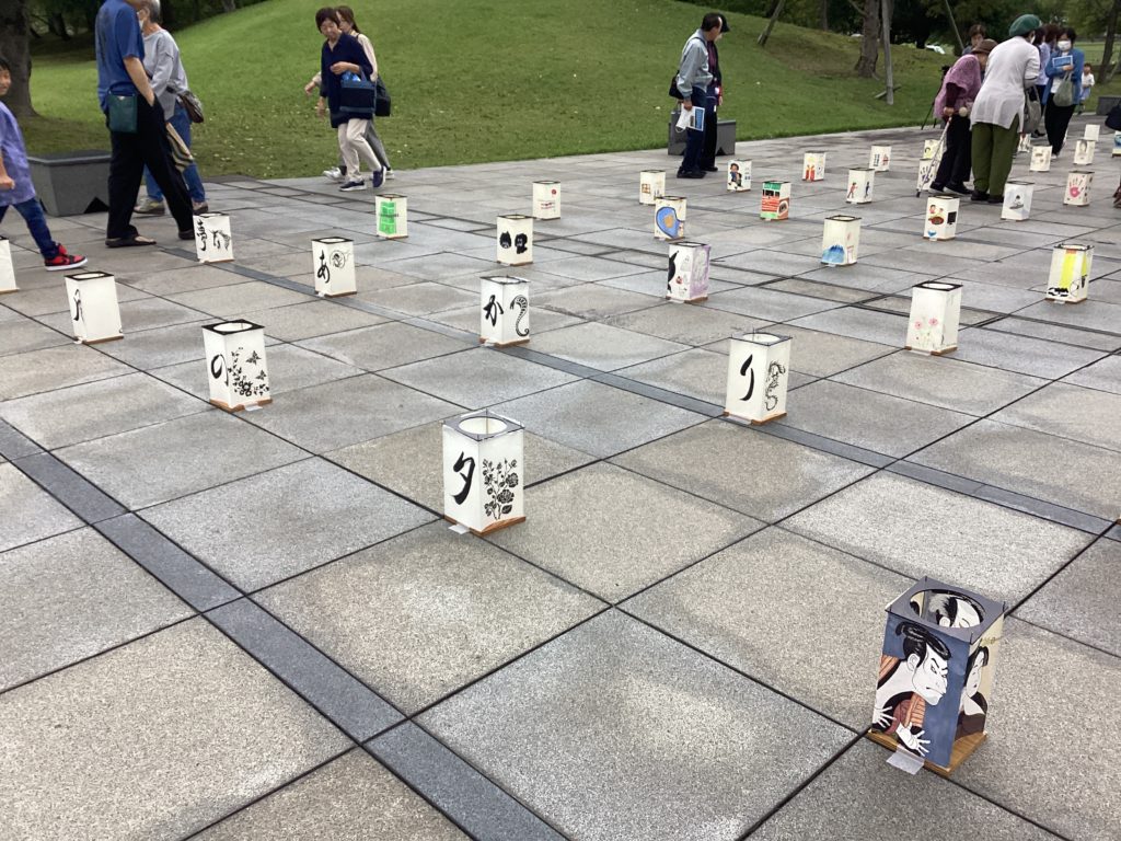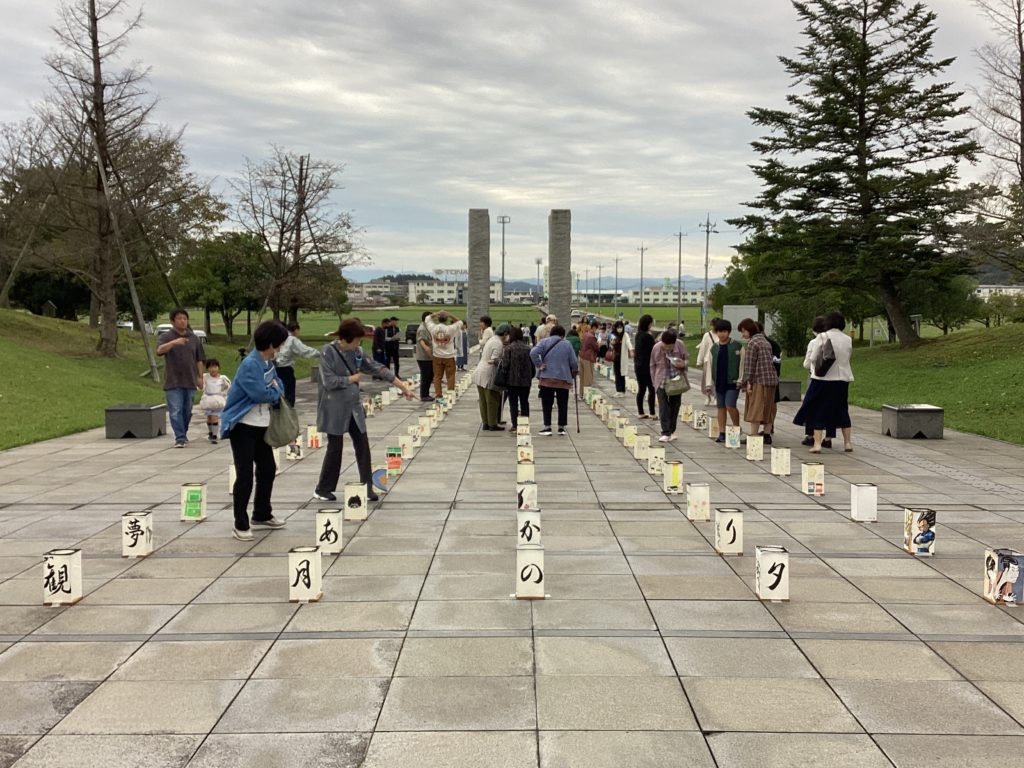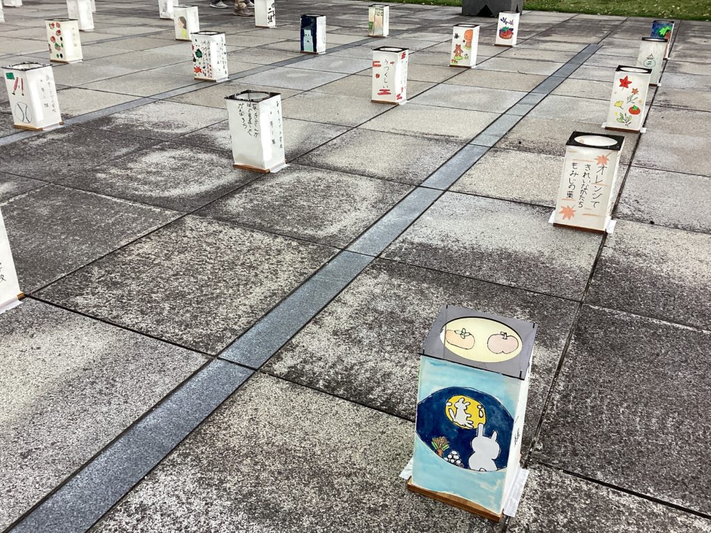 演奏後、正面玄関を出ると、「観月の夕」の時に天候不良で飾れなかった麻生津小学校の子供たちの行燈が、迎えてくれました。着火されていなくても、十分に見応えのある、素晴らしい行燈ばかりでした。地域の方、ご家族の方も、一つ一つ楽しみそうに見ておられて、本当に、あそうづの力を見せていただきました。観月の夕の運営をしてくださった地域の皆さま、心よりお礼を申し上げます。ありがとうございました。