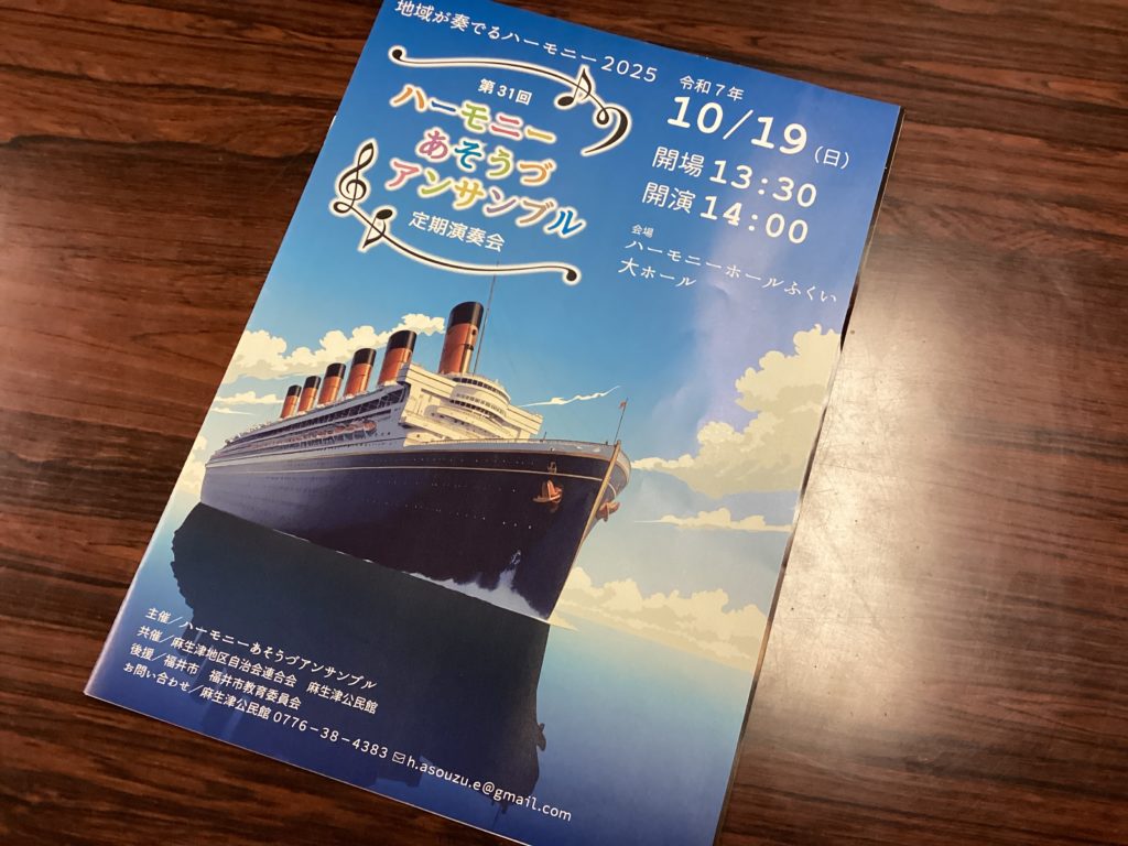 第31回「ハーモニーあそうづアンサンブル」定期演奏会が開催されました。足羽中学校の吹奏楽部が協演しています。自治連や公民館の皆さんが運営にも参加し、子供たちが地域の中に溶け込み「音楽の街あそうづ」そのものの演奏会でした。ポップスからクラッシックまで魅力的な曲が続き、会場でリズムにのりながら聴いておられる方もたくさんいらっしゃいました。