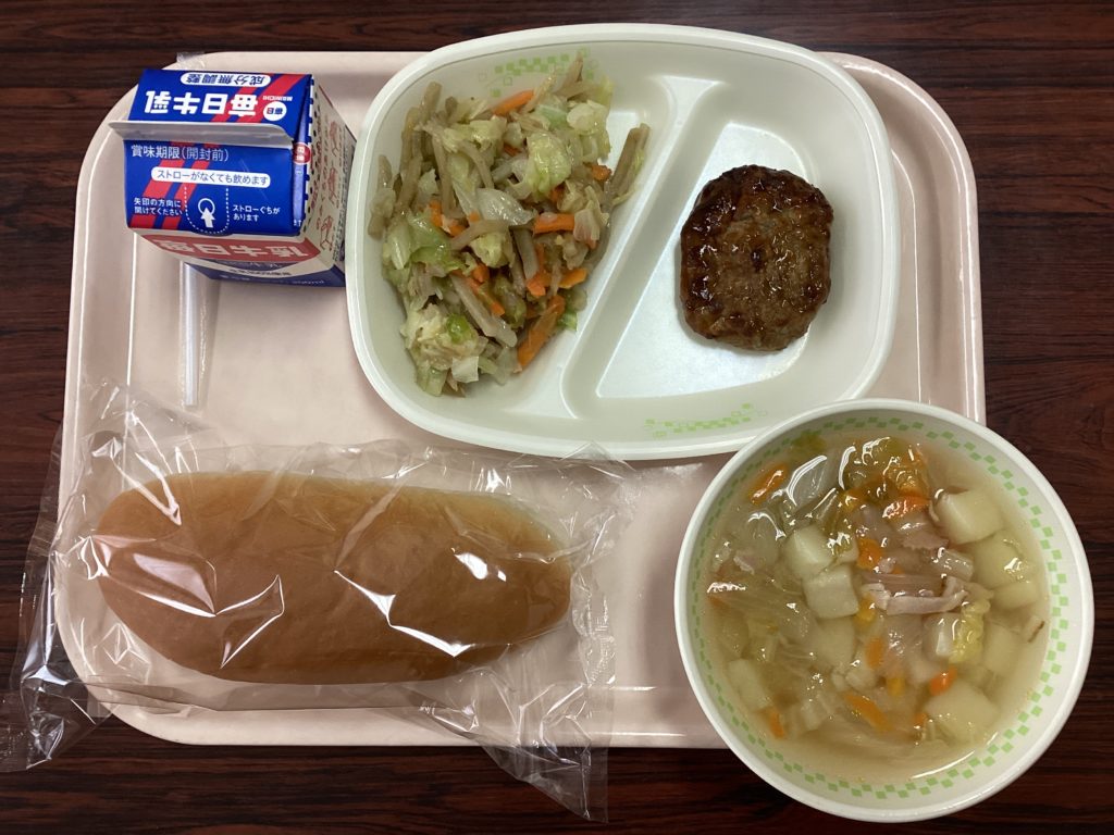 今日の献立は、「コッペパン・ハンバーグ照り焼きソース・ごぼうサラダ・野菜スープ」です。久しぶりのパンです。ハンバーグは子供たちに大人気!サラダといっしょにパンにはさんで食べる子も多いです。いつもおいしい給食を作っていただいて、ありがたいです。みなさん、よくかんで、いただきましょう。