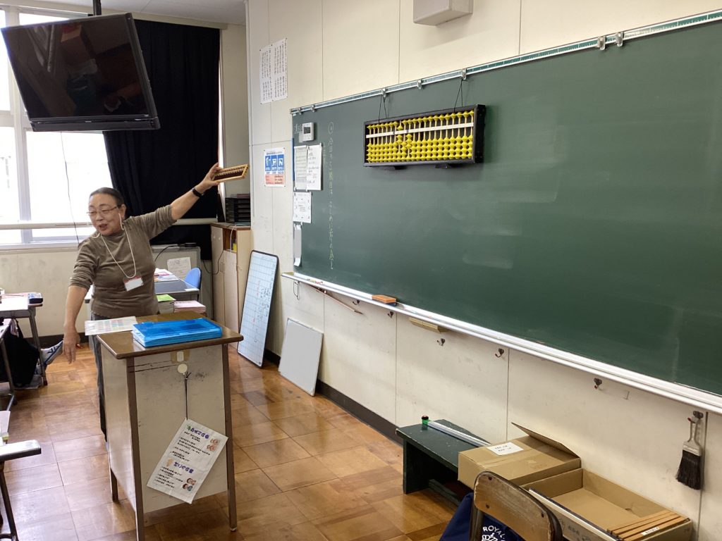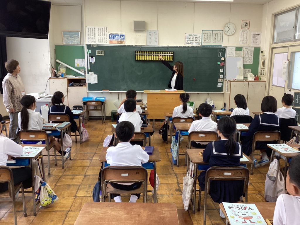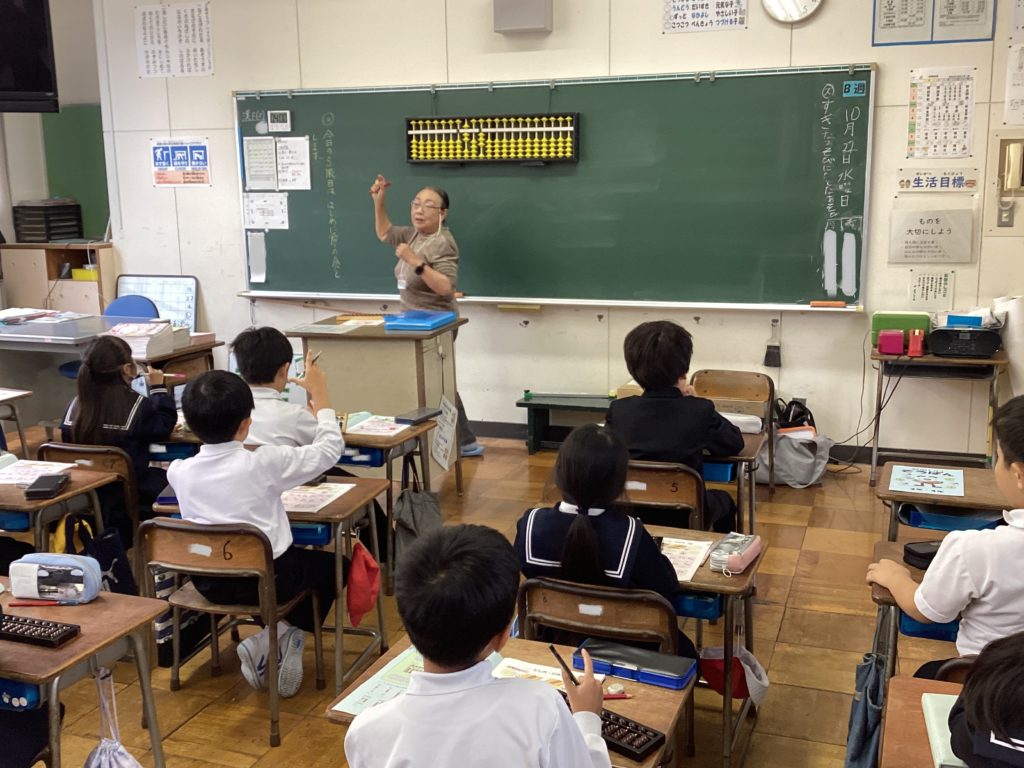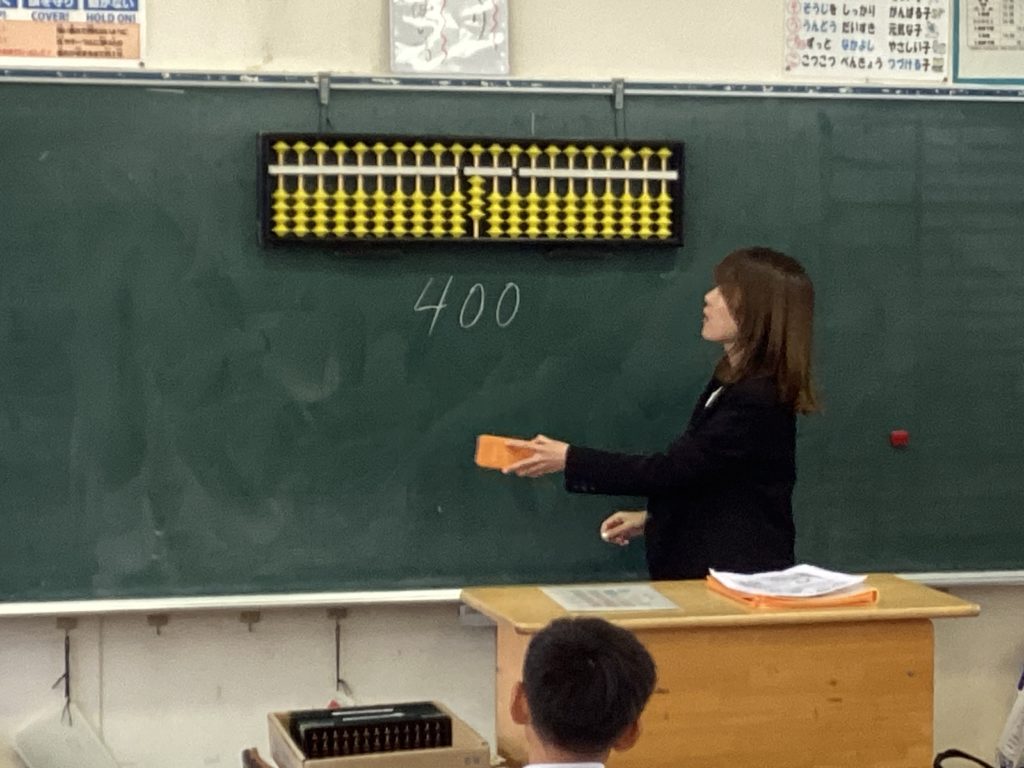 3年生の算数「そろばん」の学習の中で、講師の先生に来ていただき、第1時間目の授業をお願いしました。そろばんを手元に置いた子供たちは「定位点」を知って指さしたり、数のはらい方を先生と一緒に行ったりしていました。一だま1こで1、五だま1こで5を表すことを知った子供たちは、先生が出されるそろばんの数字を楽しそうに呼んでいました。視覚的にわかりやすく、それぞれの位の下に数を入れて、自然と読めるようにしてくださっていました。今後の授業につながっていく楽しい活動でした。講師の先生方、ありがとうございました。