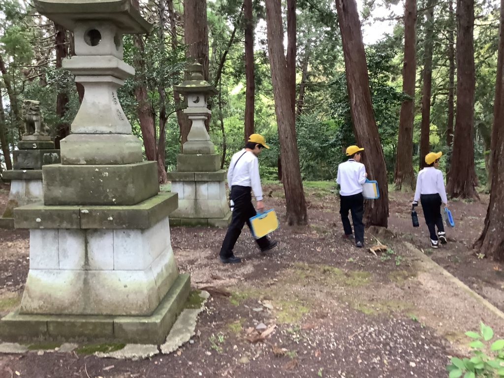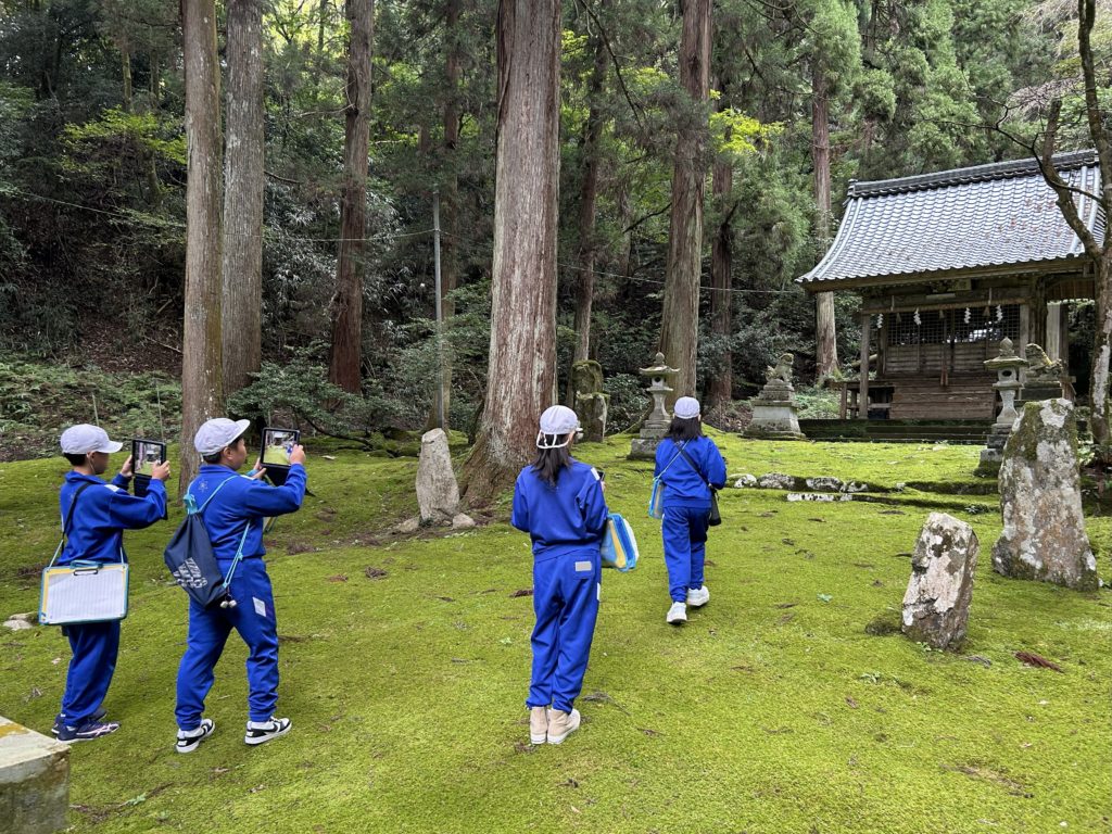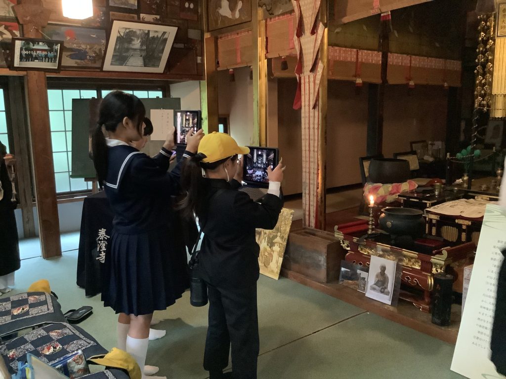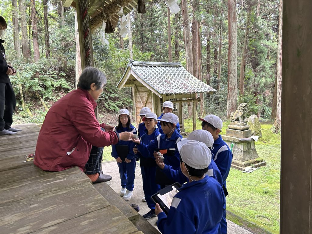 5年生が、総合的な学習の時間に、「麻生津地区の魅力発信」のテーマの下、麻生津地区の寺や店などを巡り、PR動画を作るため、写真や動画を撮影し、魅力を言葉で記録してきました。写真は、「城山」「猿田彦神社」「泰澄寺」の様子です。麻生津地区自治会連合会会長の森本様はじめ、麻生津公民館館長様、清明公民館館長様にもご尽力をいただき、活動を共にしてくださいました。地域の宝(人・もの・こと)について、夏休みに自主学習で調べ、自分たちが魅力発信をしたい場所を選んで、グループに分かれました。他には、「ハーモニーホールふくい」「泰澄寺」「増永眼鏡「OSLO」「あさむつ橋」「八幡神社」です。自分の思いで選んで活動しているので、動画の撮り方も工夫していました。地域の方々とのかかわりを通して、子供たちは自分の地域に誇りと愛着をもっていきます。